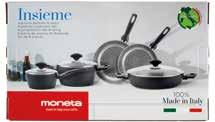 Batteria pentole MONETA 8 pezzi corpo in alluminio forgiato - rivestimento artech stone - fondo adatto alla cottura ad induzione - maniglie in bachelite - spessore 2,6 mm composizione: padella Ø cm 20 + cm 24 + casseruola 1 manico Ø cm 16 + casseruola 2 manici Ø cm 20 + tegame 2 manici Ø cm 28 + coperchio vetro Ø cm 16 + cm 20 + cm 28 € 39,90