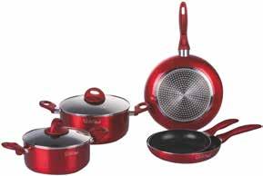 PENTOLE 7 PEZZI IN ALLUMINIO - rivestimento antiaderente - spessore 2 mm - adatta a tutti i tipi di cottura compresa induzione - rivestimento esterno rosso metallizzato - manico rosso atermico soft touch - coperchi in vetro temperato con valvola di uscita vapore - composizione: padella diam. cm. 20 + 24 + 28, casseruola diam. cm. 20 + 24, coperchio diam. cm. 20 + 24