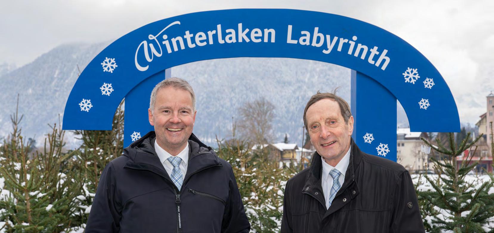 Daniel Sulzer und Erich Reuteler vor dem Winterlaken Labyrinth.