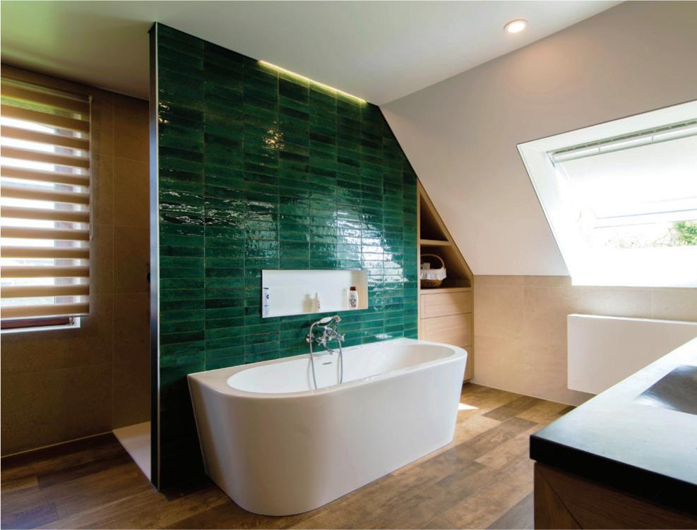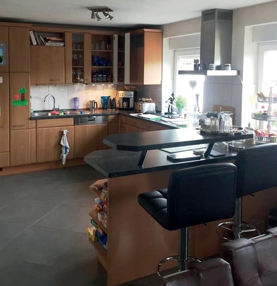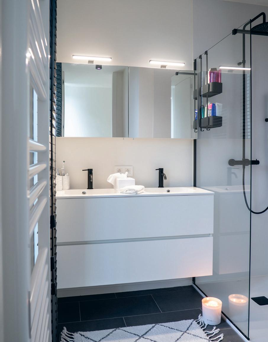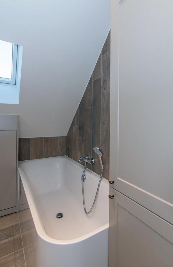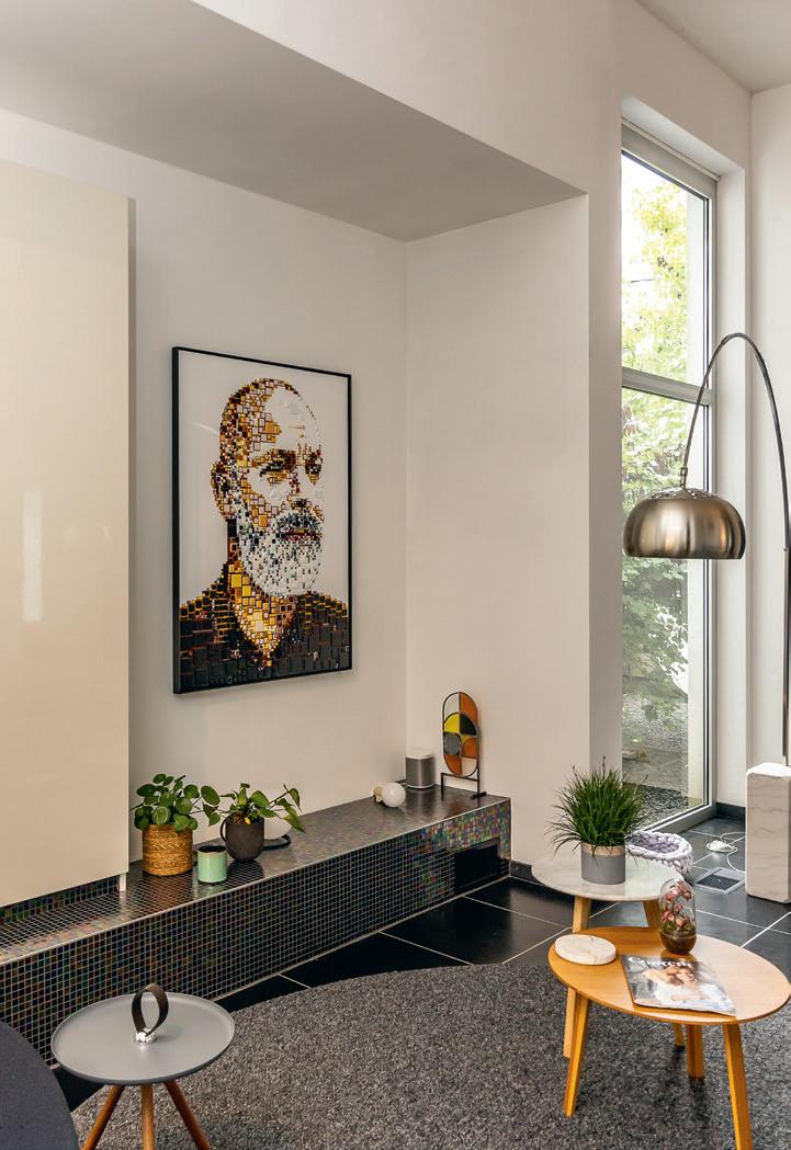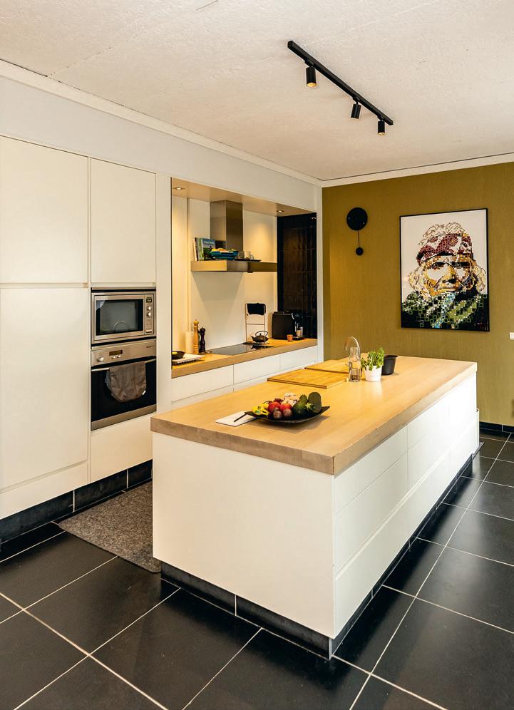 Destijds gingen we aanbellen bij één van de huizen die we mooi vonden. Vervolgens stapten we met een dromenboek vol foto’s en interieurknipsels onder de arm naar die architect. Al snel bleek dat hij ook de andere huizen die ons bevielen getekend had… Straf hé! (lacht) Toch is er gaandeweg héél wat veranderd. Onze zoon Faber is intussen ook architect; van hem namen wij de suggestie aan om van onze trap een zwarte snede te maken. We bedekten de wand met tegeltjes die je eveneens in een stukje van de keuken terugvindt. Hierdoor heeft onze trap een écht ‘luxe’ hotelgevoel gekregen.