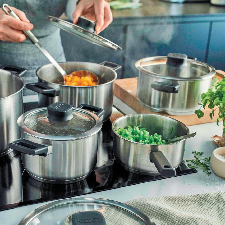De pannen hebben drie roestvrij stalen lagen die voor indrukwekkende kook- en bakresultaten zorgen. Dankzij de Evershine technologie uitzien. Bovendien zorgt het voor een optimale warmteverdeling. De Thermolon keramische antiaanbaklaag, de Infinity Pro, is versterkt met diamant en is extreem duurzaam, krasbestendig en PFAS-vrij. Voor alle warmtebronnen, inclusief inductie en oven.