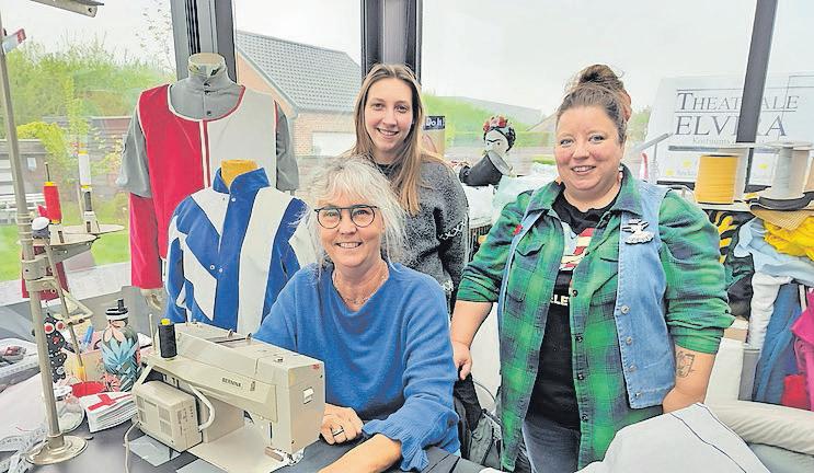 vervaardigt, samen met haar medewerkers (op de foto: Christa, Kirsten met rechts Elvira) de kostuums. “Soms zit ik wel tot 2 uur ‘s nachts te werken omdat ik een deadline moet halen”, zegt ze. “Vaak neem ik ‘s avonds ook nog mijn schetsboek”.