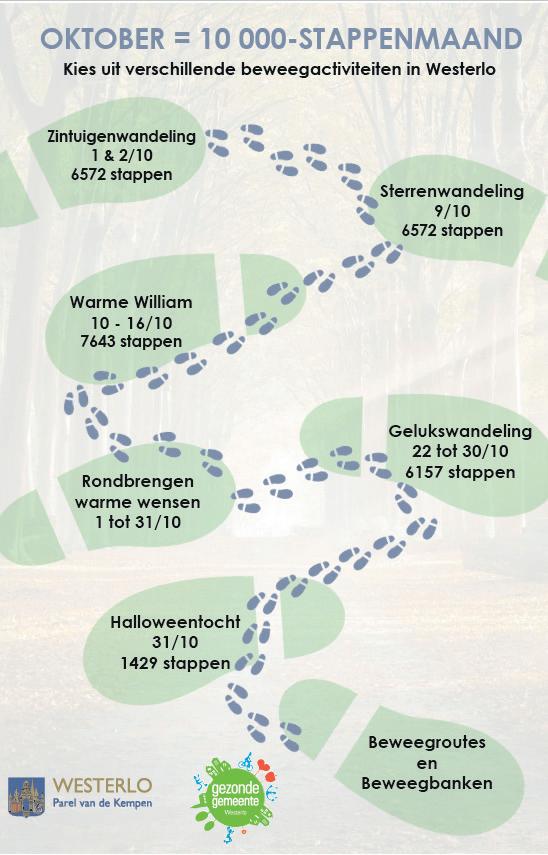 De hele maand oktober zet Westerlo extra in op meer bewegen en een goede mentale gezondheid. Met deze 10 000 stappen actie in oktober en deze bijhorende 10 000 stappen brochure, maken we voor jou een overzicht met alle activiteiten die jou kunnen helpen om meer stappen te zetten en te werken aan je fysieke en mentale gezondheid.