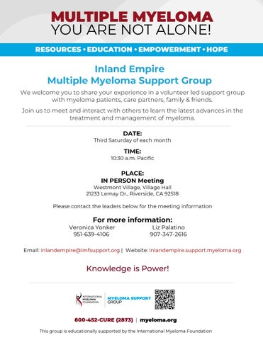 Founded in 1990, the International Myeloma Foundation (IMF) is the first and largest organization focusing specifically on multiple myeloma. The IMF’s reach extends to more than 525,000 members in 140 countries worldwide. The IMF is dedicated to improving the quality of life of myeloma patients while working toward prevention and a cure through our four founding principles: Research, Education, Support, and Advocacy.