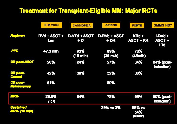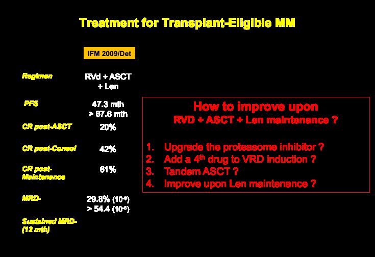 IFM 2009: Early vs Delayed Autologous Transplant VRd Transplant Lenalidomide maintenance x 12 months VRd Lenalidomide maintenance x 12 months Delayed transplant at relapse 700 patients Newly diagnosed MM Age <65