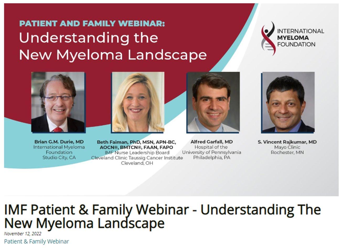 10:55 – 11:10AM Q&A 11:10 – 11:25AM BREAK 11:25 – 11:50PM Supportive Care - Beth Faiman 11:50 – 12:05 PM Q&A 12:05 – 12:30PM Relapse and Role of New Immune Therapies - Dr. Garfall