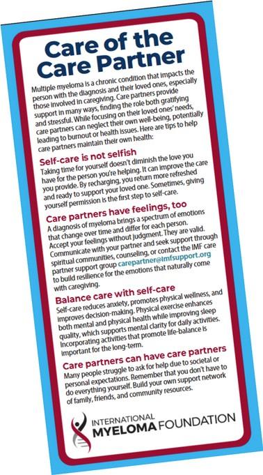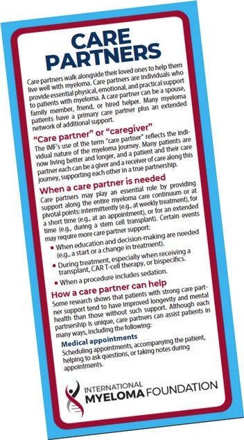 Care partners may help with medical appointments, managing medication, daily living, physical assistance, emotional support, myeloma knowledge, healthy lifestyle, patient advocacy, financial decisions