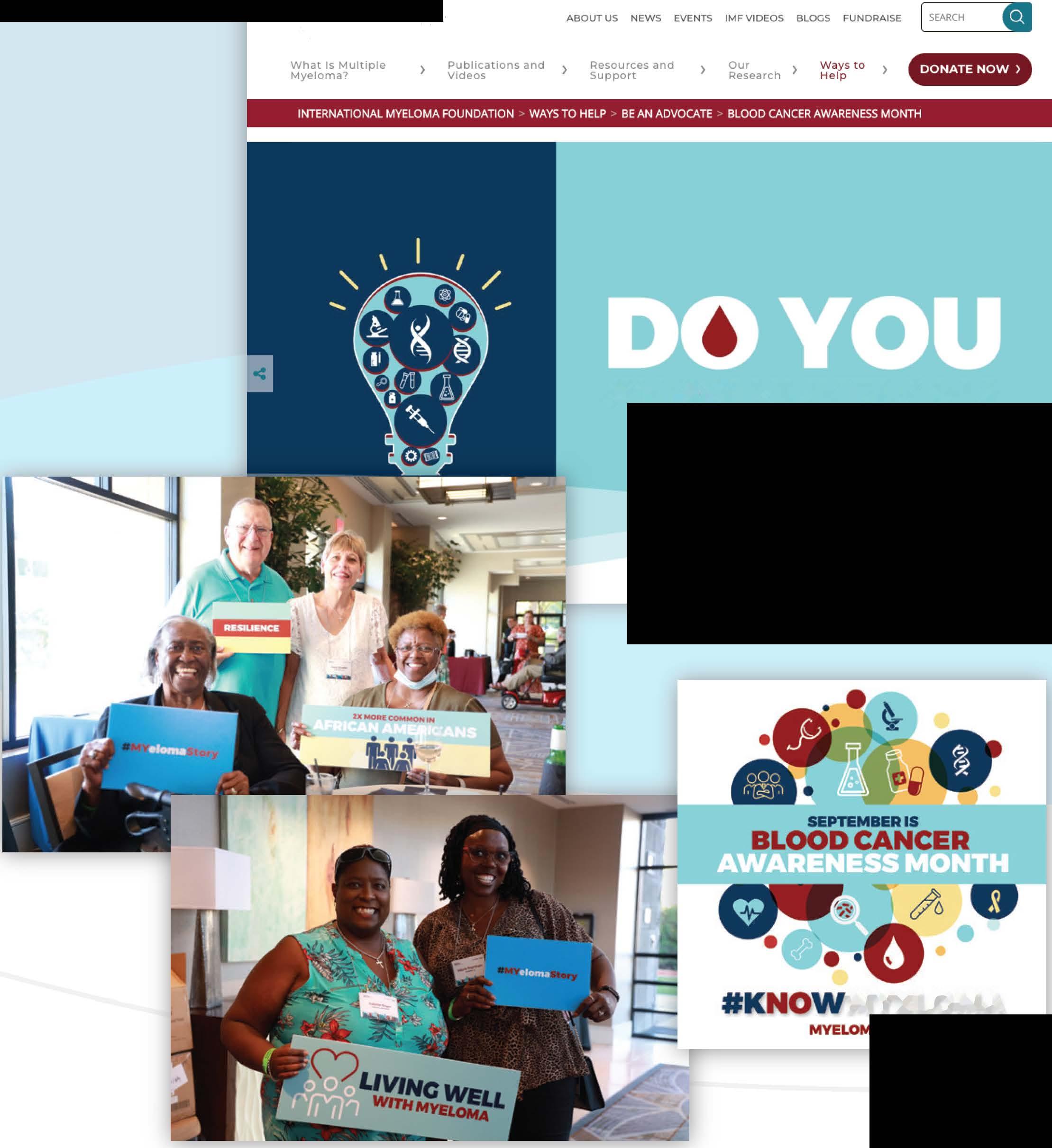 The IMF's BloodCancerAwareness website at knowmyeloma.org has a rich trove ofmyeloma facts, research breakthroughs in myeloma treatment, andinspirationalstories ofhope and resilience fromthose living withthe disease.