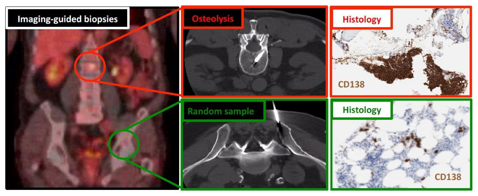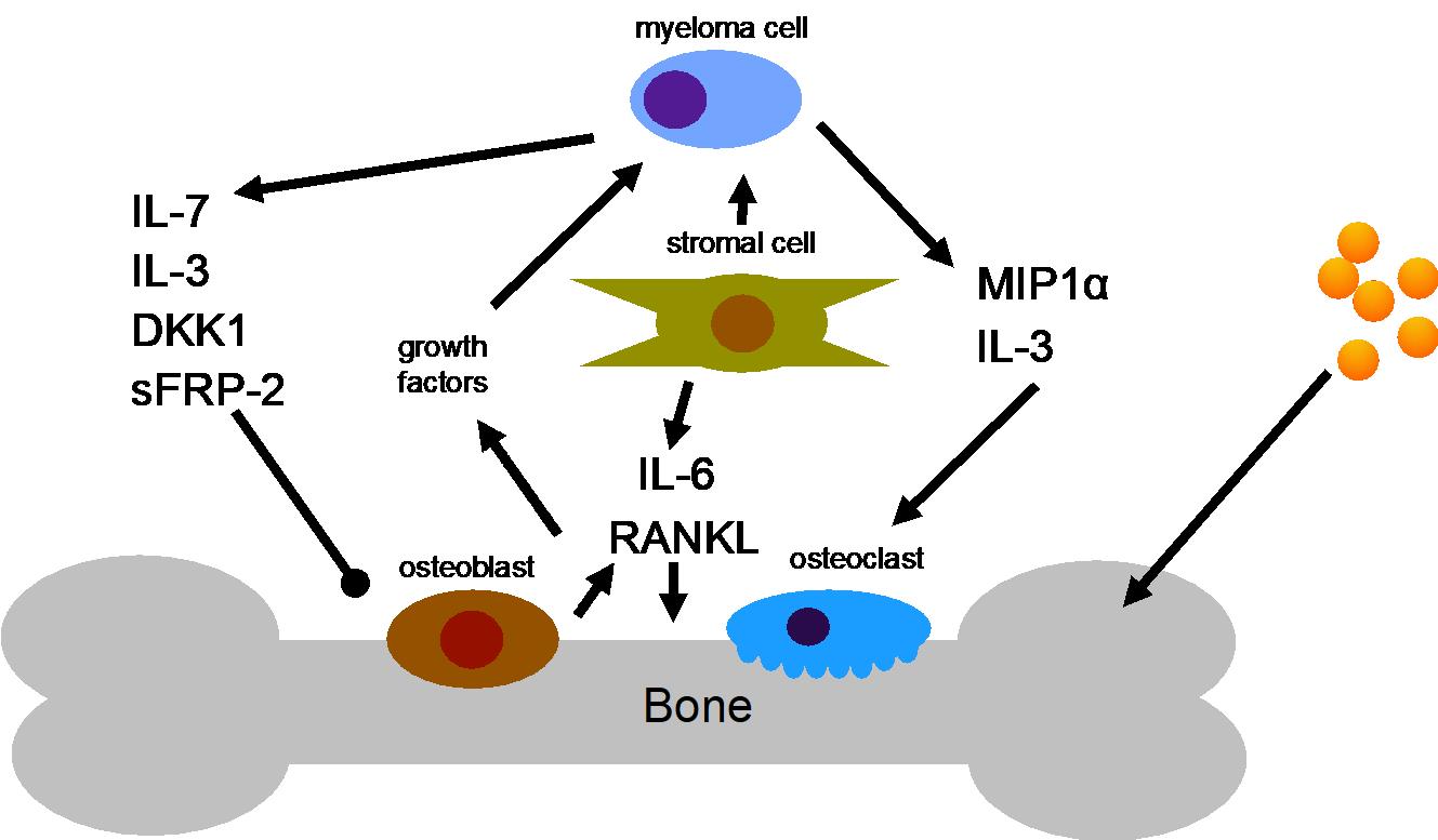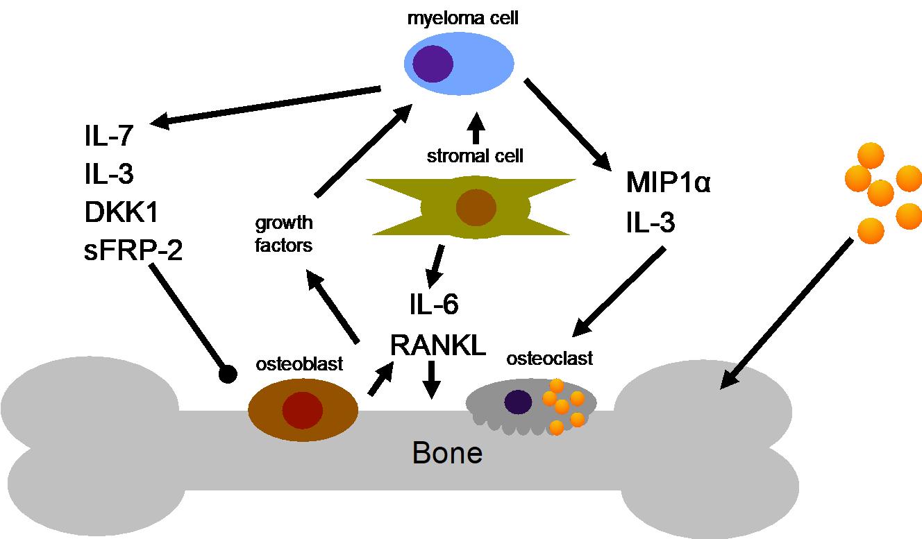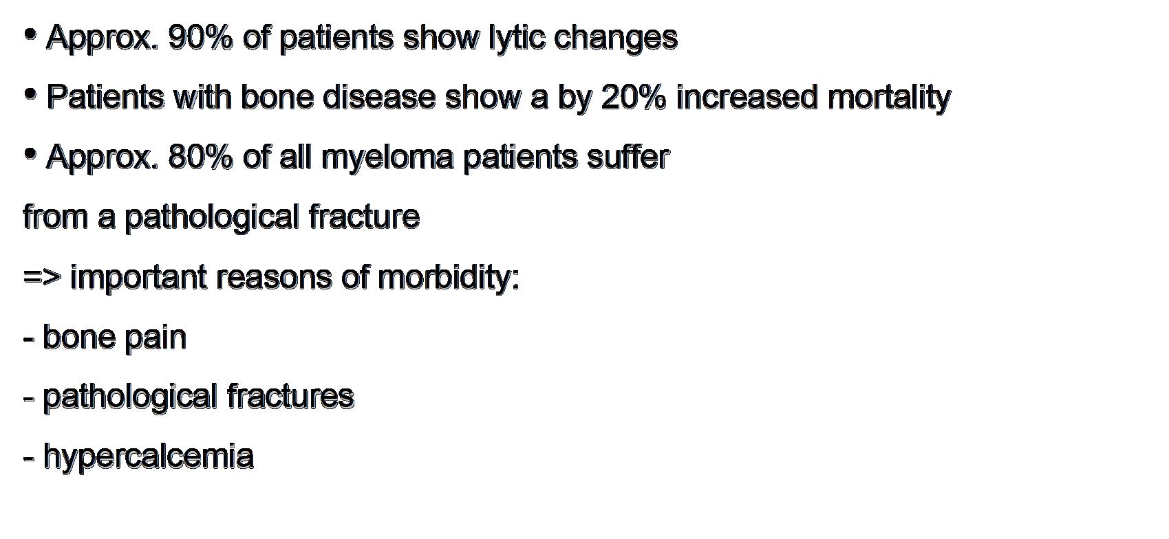 Osteoclasts: • Increased Number of osteoclasts and -activity especially in proximity of myeloma cells Osteoblasts: • Reduced osteoblast activity in proximity of myeloma cells • Normal to increased osteoblast activity in other regions => bone destruction by myeloma leads to formation of a „scar“