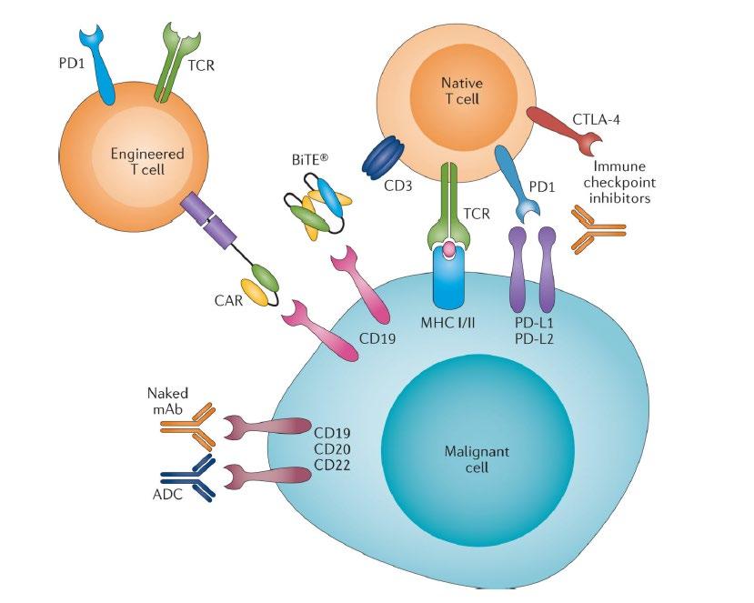 • Incorporates 2 antibody fragments to target and bind both tumor cells and T cells