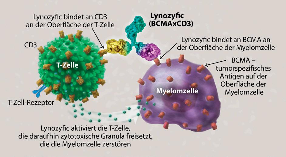 Lynozyfic ist ein bispezifischer Antikörper, der an das auf der Oberfläche von Myelomzellen exprimierte B-ZellReifungsantigen (BCMA) und an den CD3-Rezeptor auf der Oberfläche von T-Zellen bindet, zwischen diesen Zellen eine Verbindung herstellt und die T-Zellen dazu anregt, die Myelomzellen abzutöten. Die FDA-Zulassung für Lynozyfic erweitert die Behandlungsmöglichkeiten für RRMM-Patienten.