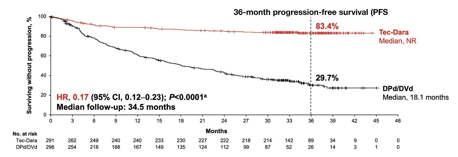 The highly anticipated late-breaking abstract from the MajesTEC-3 phase III clinical trial, which compares the combination of the bispecific antibody Tecvayli® (teclistamab-cqyv) plus the monoclonal antibody Darzalex® (daratumumab) to the standard approach with a triplet (3-drug) combination in patients with 1 to 3 prior lines of therapy.
