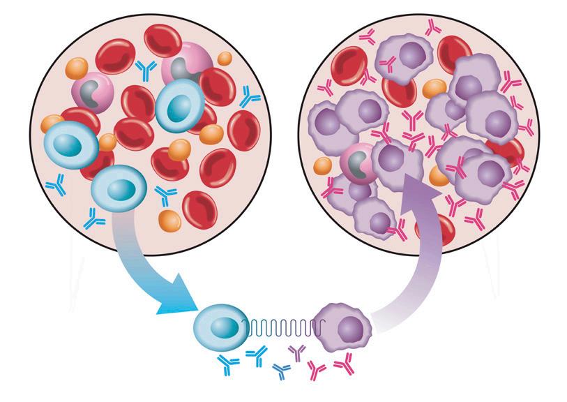 Las células del mieloma son células plasmáticas cancerosas monoclonales (duplicados de una sola célula) que proliferan (crecen) de forma descontrolada en una cantidad tan grande que saturan la médula ósea (véase la Figura 2).