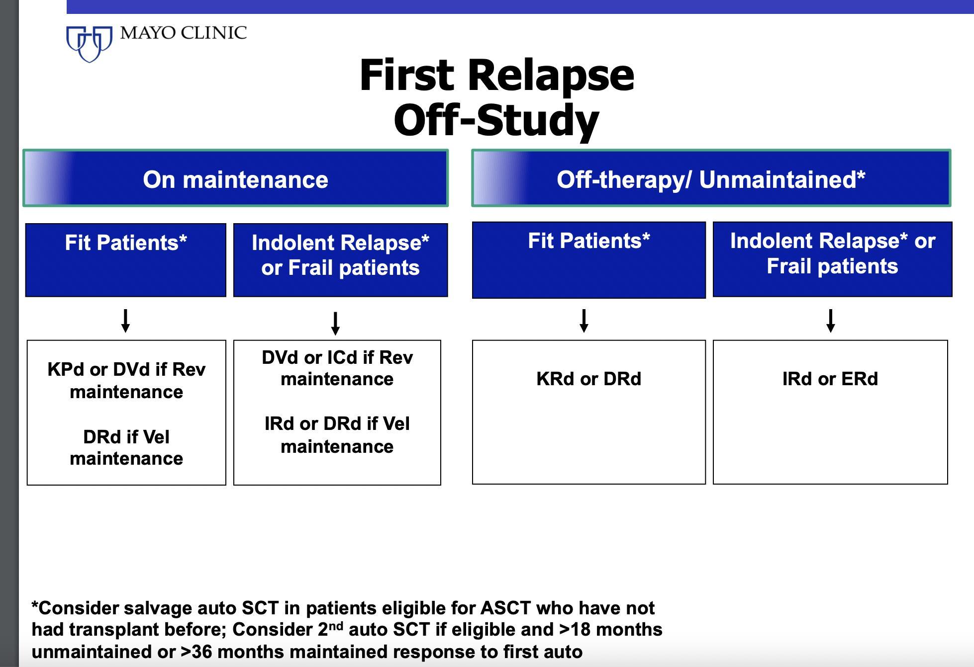 Neuropathy Carfilzomib: Cardiac Infusion reaction DVT/PE See steroid slide Myelosuppression Infusion reaction Blenrep: Keratopathy Myelosuppression, GI Selinexor: Low sodium Infection risk CAR T: CRS and neurotoxicity Frontline Relapse Pending FDA Approval Maintenance