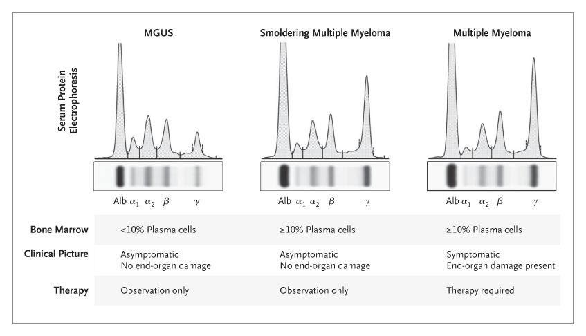 • Each myeloma cell (clone) makes and releases one type of antibody (gamma globulin) into the circulation (monoclonal gammopathy)