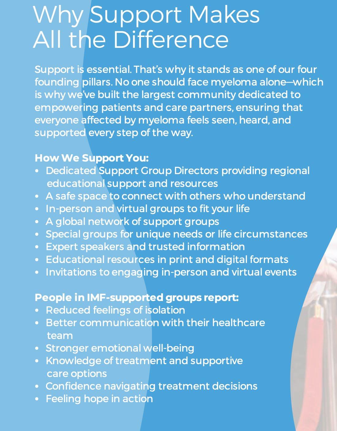 Support groups are a core pillar of the IMF. We are proud to stand alongside you in providing meaningful, consistent and compassionate support to those impacted by myeloma.