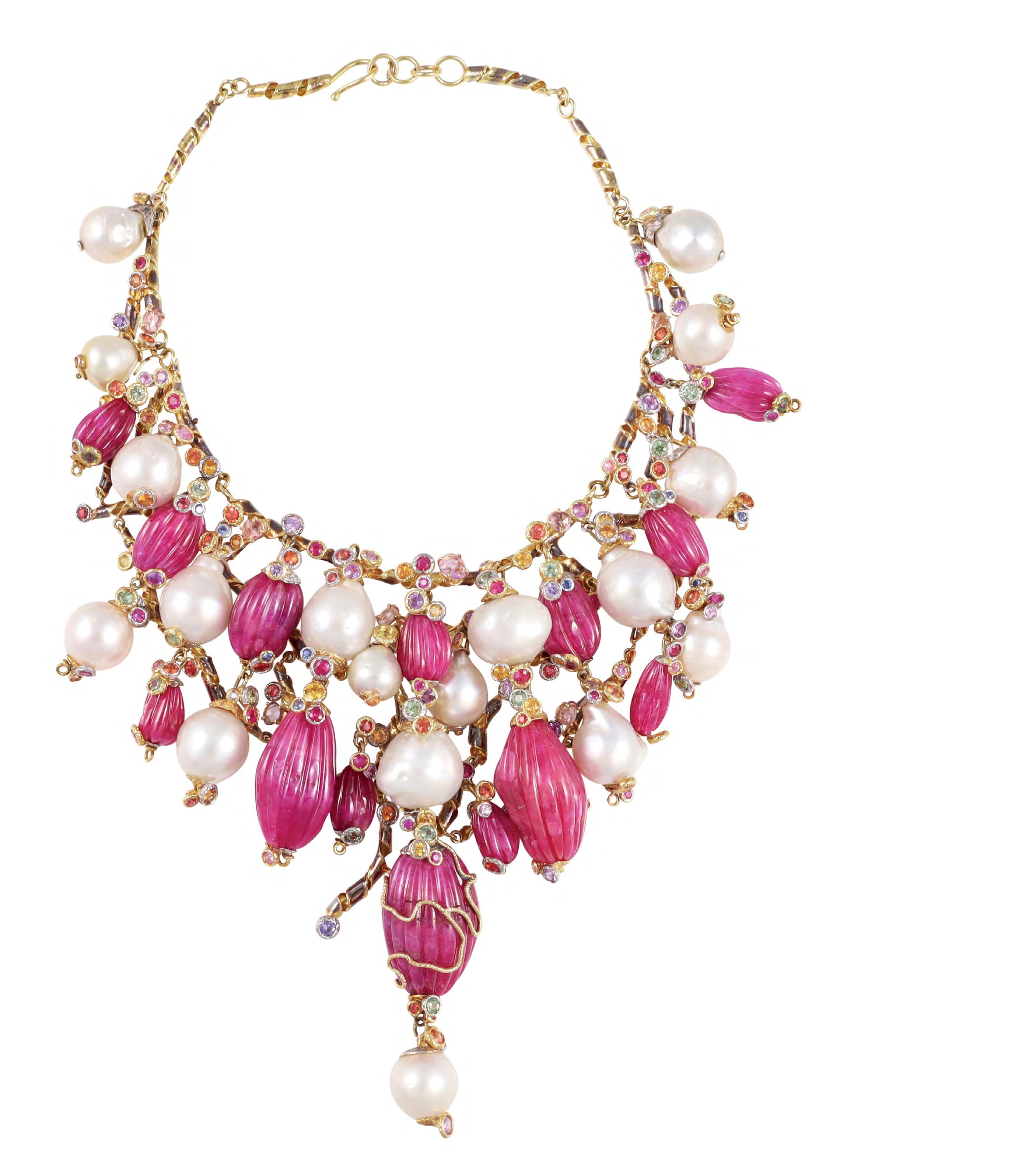 STEEL AND 18KT GOLD NECKLACE WITH RUBIES AND EMERALD
