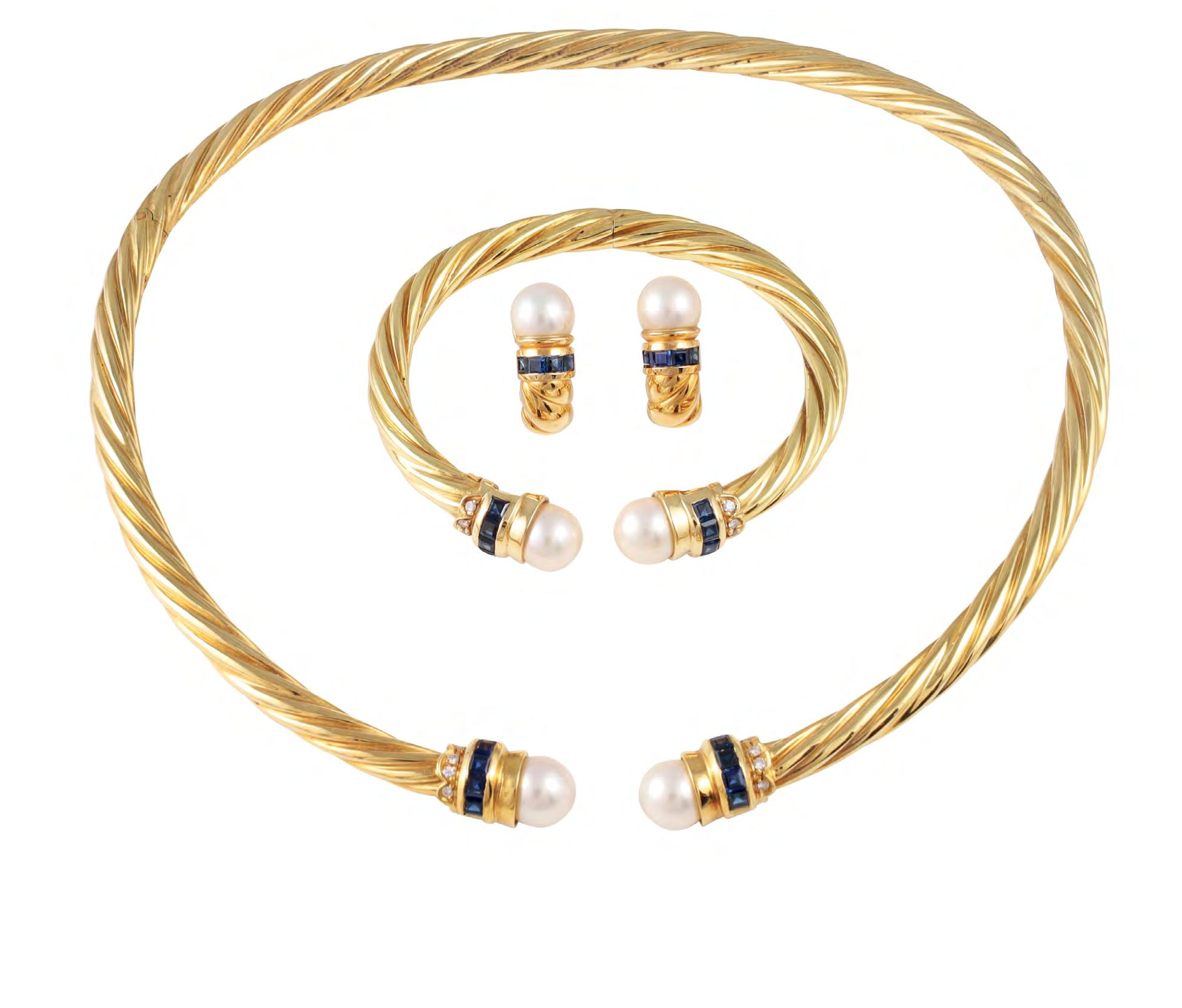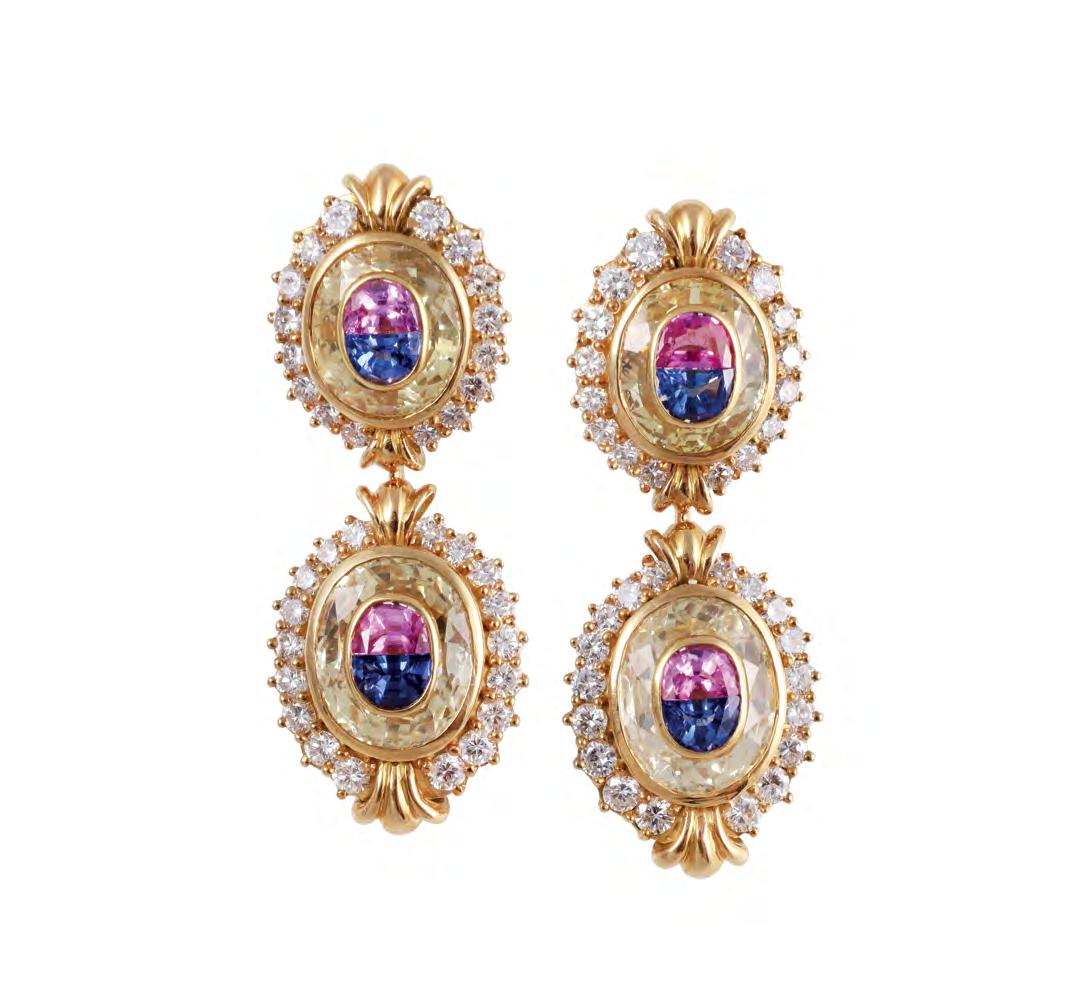 in oro giallo e bianco, ciascuno con al centro uno zaffiro ovale contornato da brillanti in pavé. Zaffiri del peso complessivo di 3 ct ca., brillanti del peso complessivo di 3,20 ct ca., gr. 13,6.