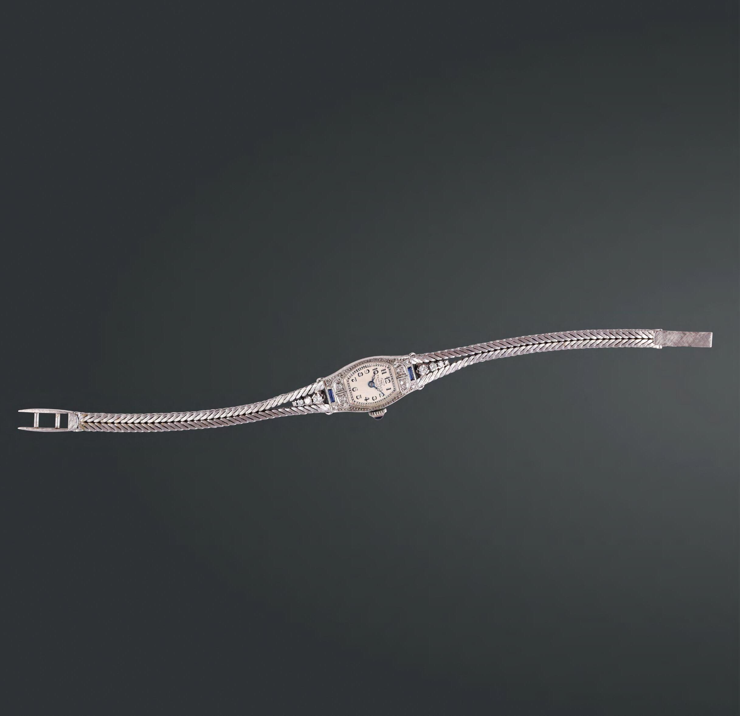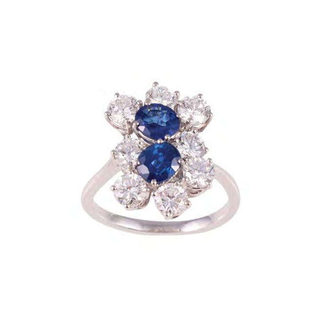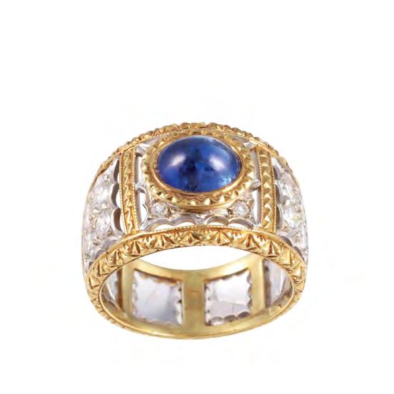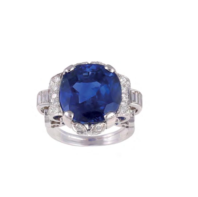 a fascia in oro bianco interamente traforato a volute con zaffiro ovale del peso di 5 ct ca. e diamanti a rosa ad ornamento (alcuni mancanti), gr. 7,5.