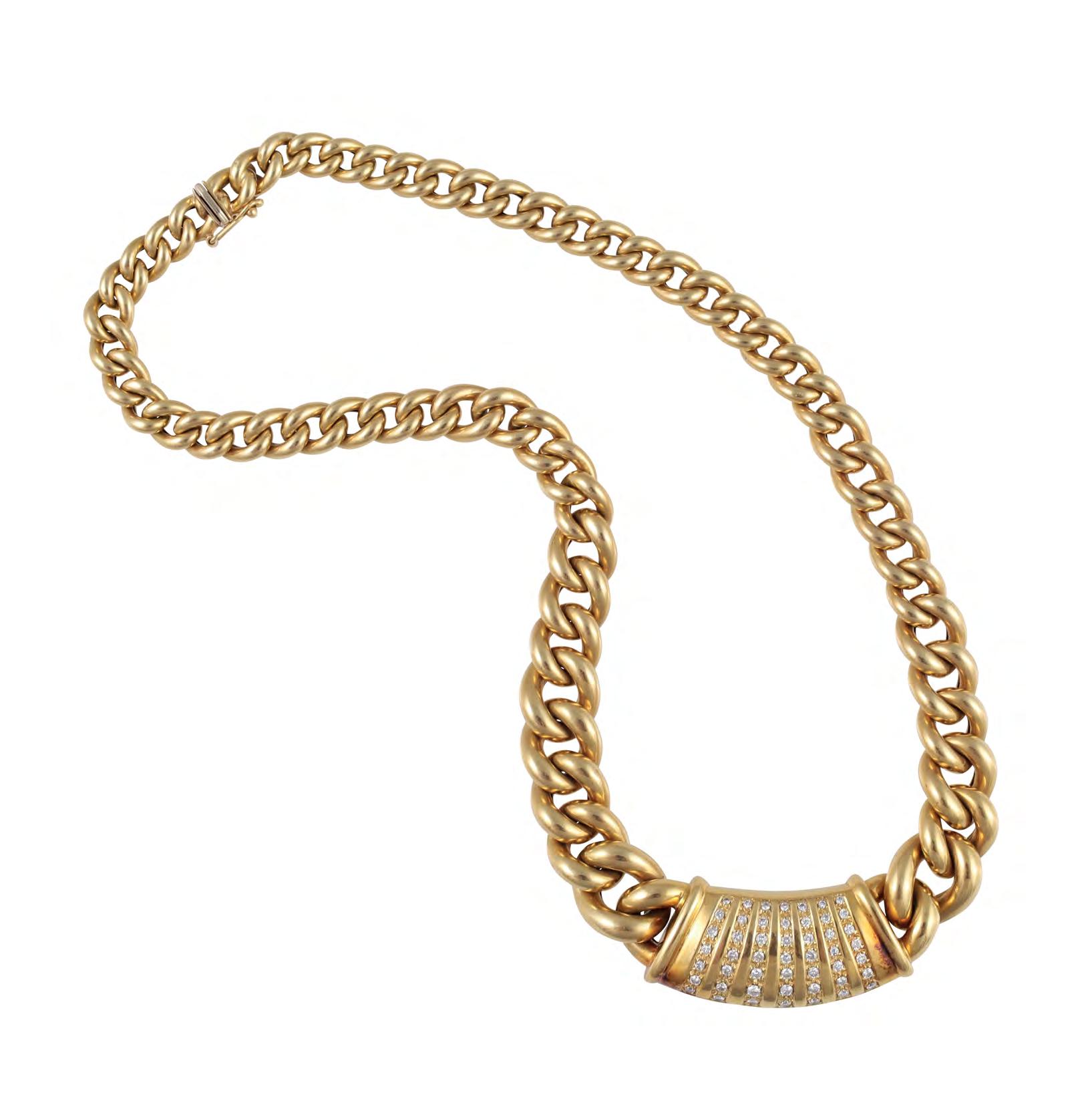 in oro giallo a maglie groumette poste in gradazione, ornato al centro da una placca ornata da brillanti, gr. 48.