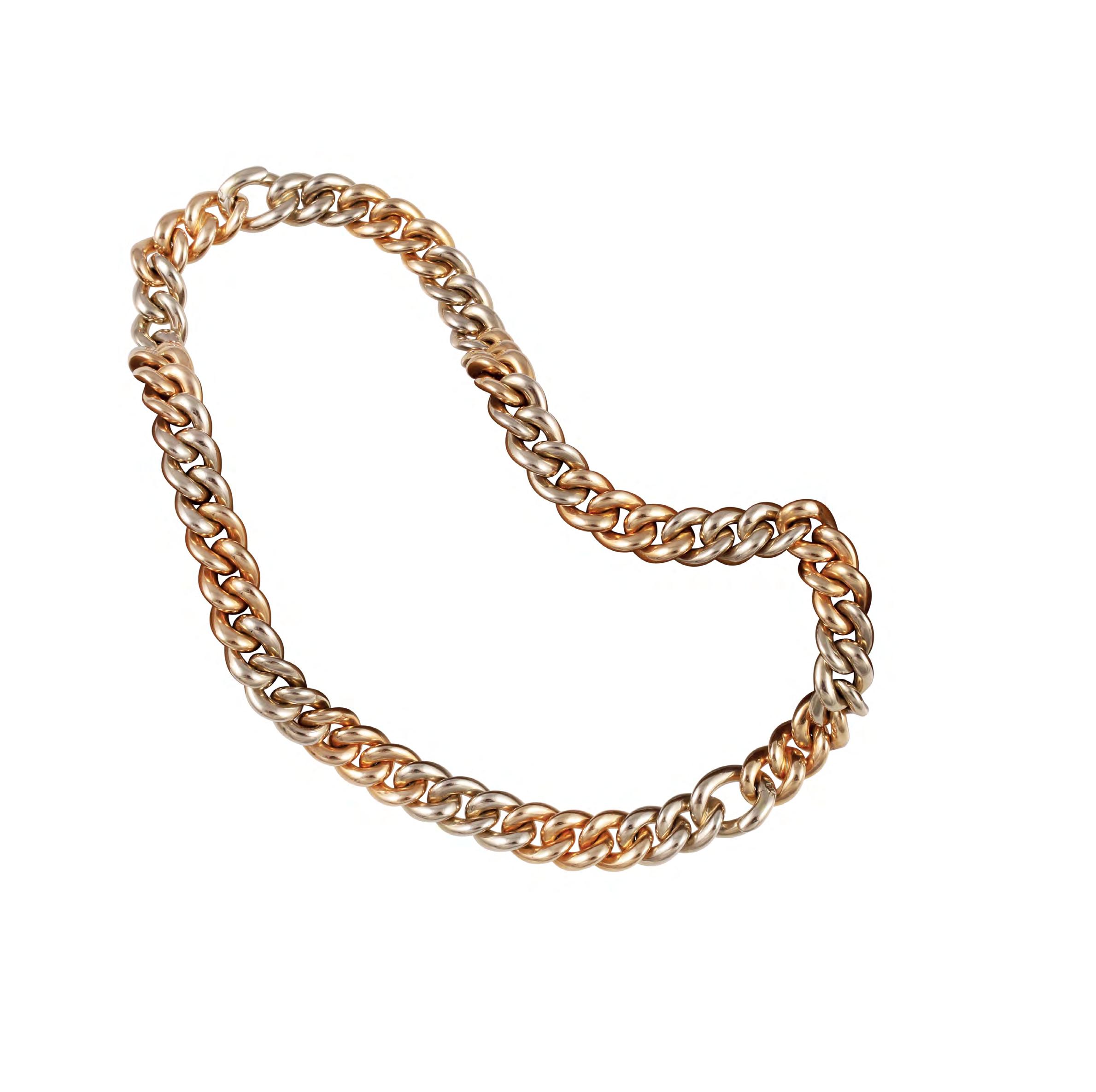 composto da maglie tonde in oro giallo, alternate a maglie ovali piatte in oro bianco, gr. 69,4.