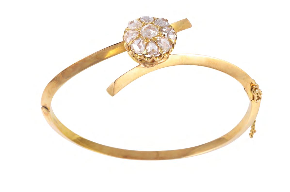rigido, in oro giallo con motivo geometrico anteriore in pavé di brillanti, gr. 64,1.