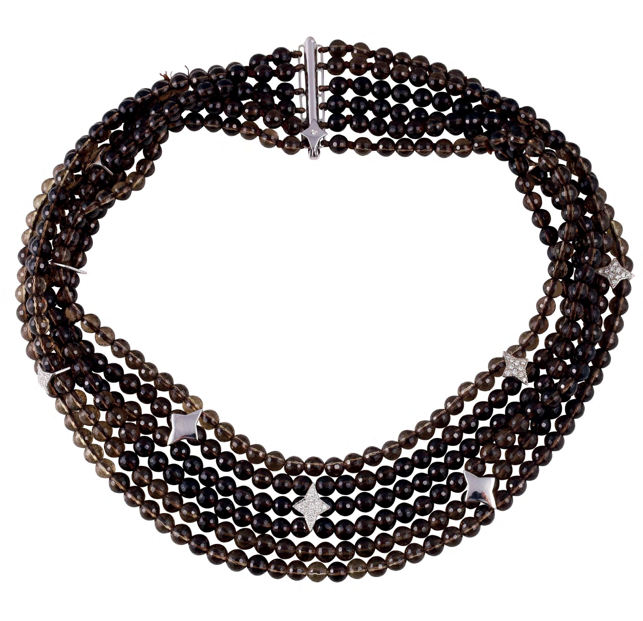 GIROCOLLO con sfere di smeraldo poste in gradazione; la parte anteriore, a due fili, è impreziosita da decori laterali in oro bianco e diamanti, gr. 41,6. Lunghezza 42 cm