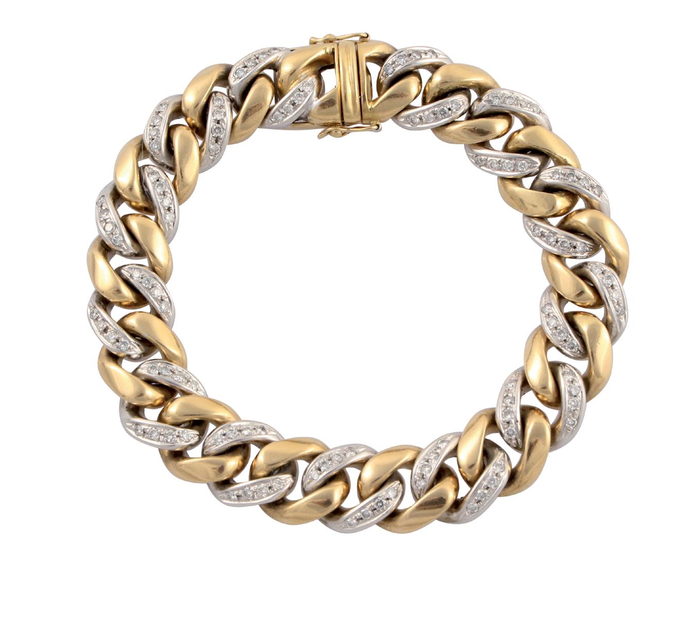 per orologio in oro giallo a maglie ovali sagomate finemente cesellate ornate da smalti policromi, munita di chiavetta di carica (alcune mancanze agli smalti), gr. 34,5.
