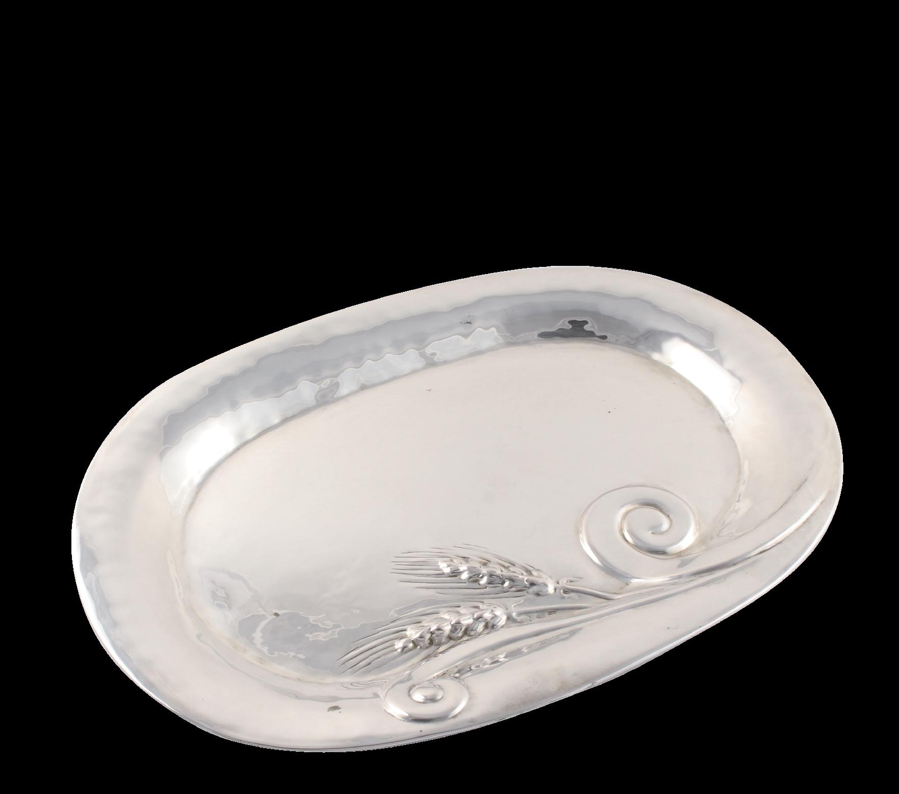 in argento liscio a corpo ovale con motivo a sbalzo raffigurante due spighe con foglie, gr. 492 ca., dimensioni 33,5 x 24 cm.