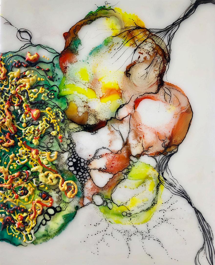 In the next stage of painting, “figures” sometimes began to emerge. As I saw shapes and images appear, I’d enhance them with gestural lines, using India ink and a dip pen. My painting became more abstract, and I began to further the depiction of growth or decay by adding a 3-Dtextured surface using a hot stylus. I delightedly, meditatively, lost track of time by adding myriad raised lines and tiny dots. These 3-D forms emerged like sculptural, topographical sea floors, mountains, and valleys.