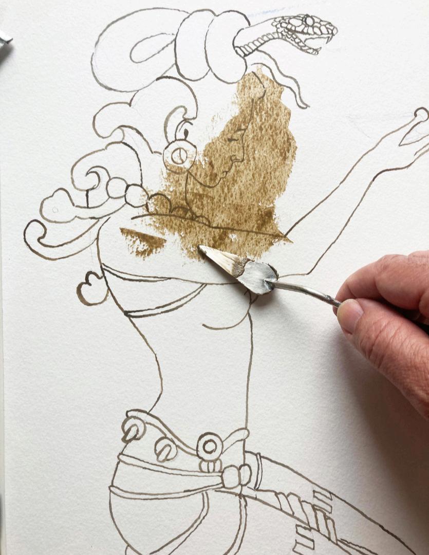 I was recently in Tulum, Mexico, and I became very interested in Mayan mythology, especially in the figure of the Mayan Goddess Ix Chel. I decided to paint on watercolor paper a version of Ix Chel because the texture the paper creates reminds me of stone, and I wanted to give it the feeling of an ancient wall painting.