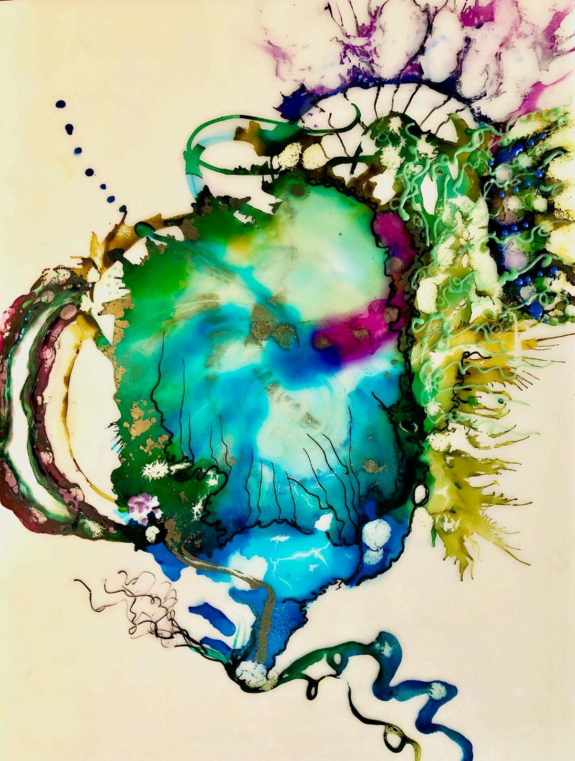 Jellyfish Spell Ink on encaustic 16 x 12 in