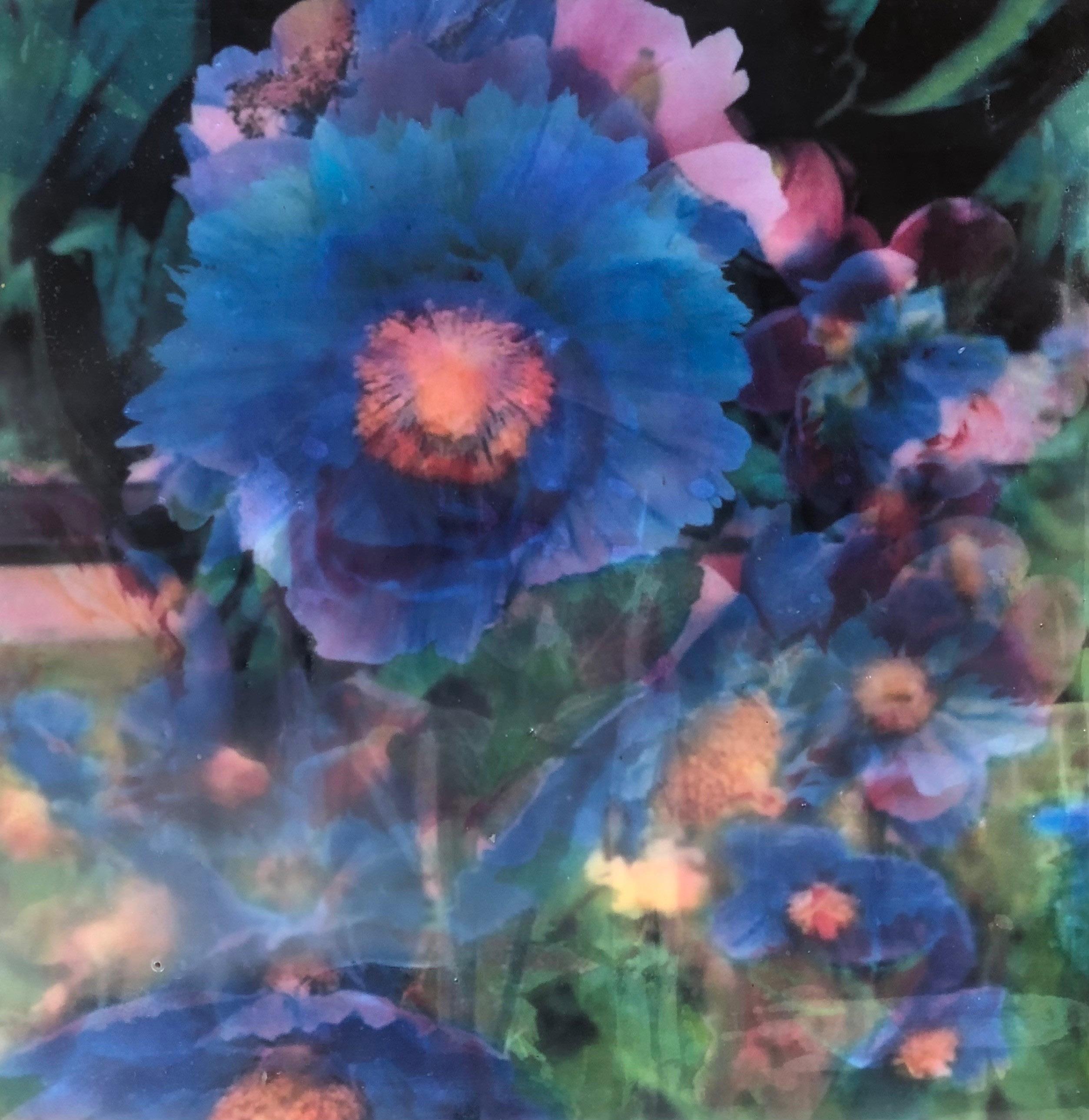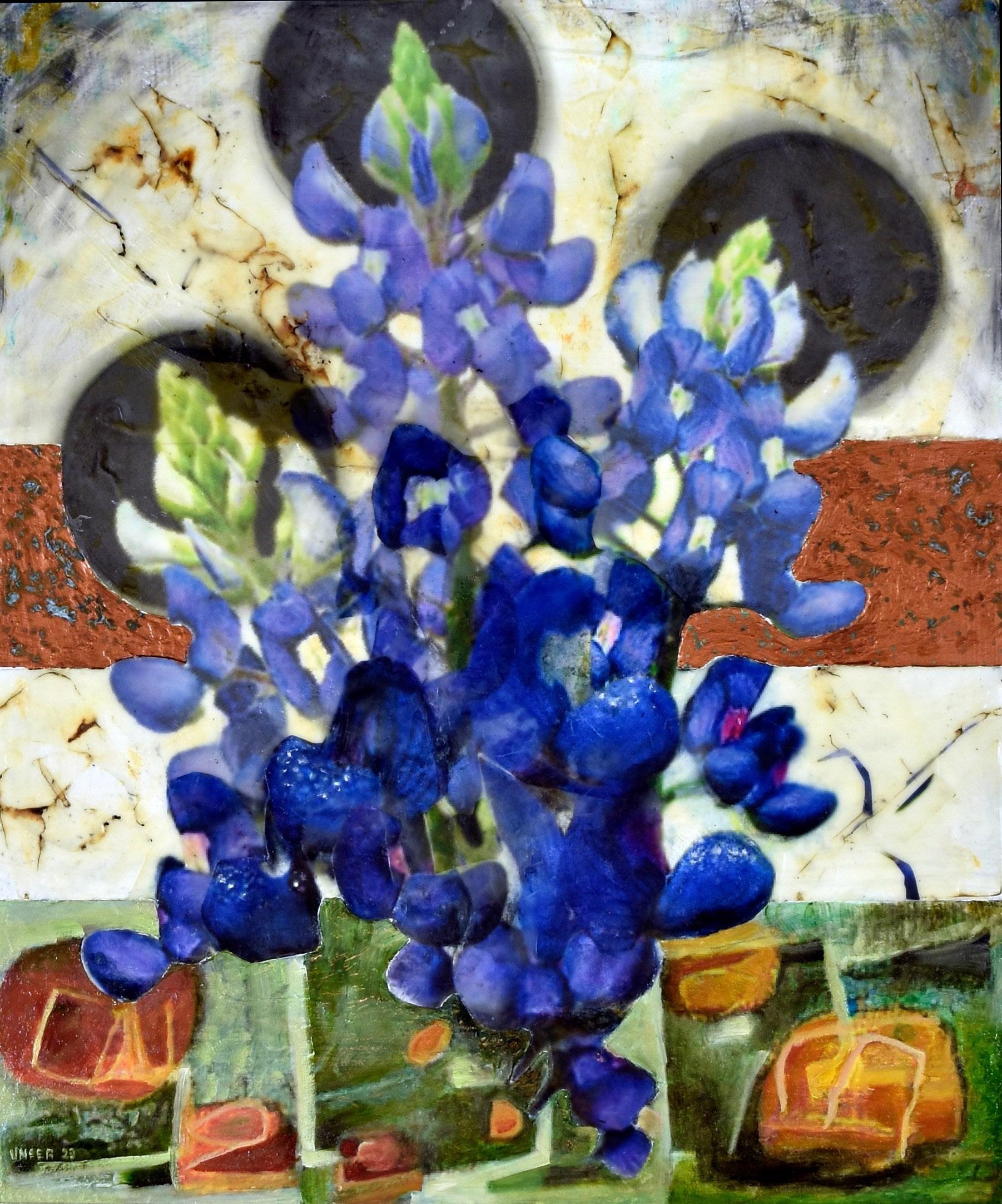 Digital collage in encaustic, copper patina, oil. Aluminum substrate combining multiple blue bonnets and two superimposed abstracts at the bottom in oil.