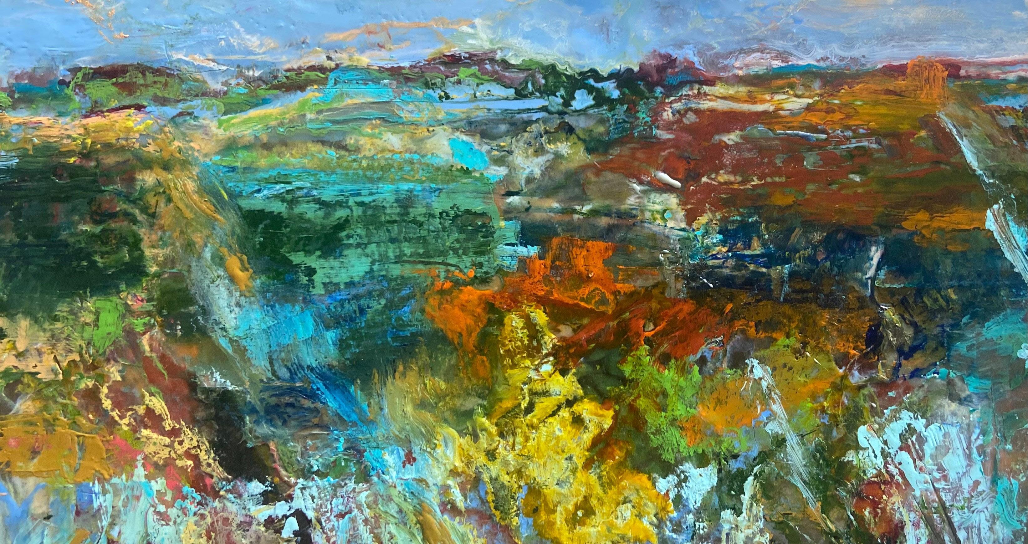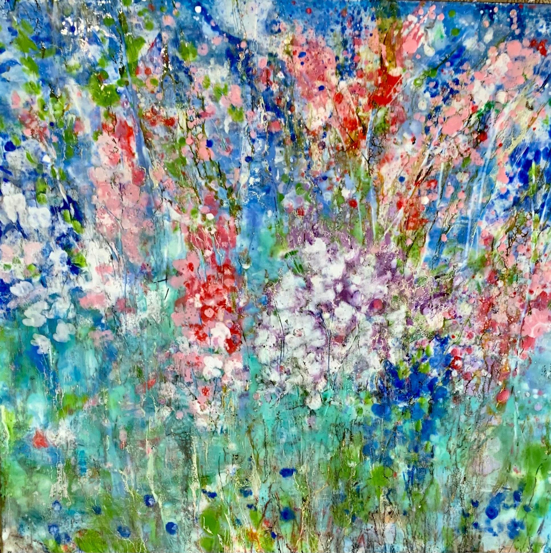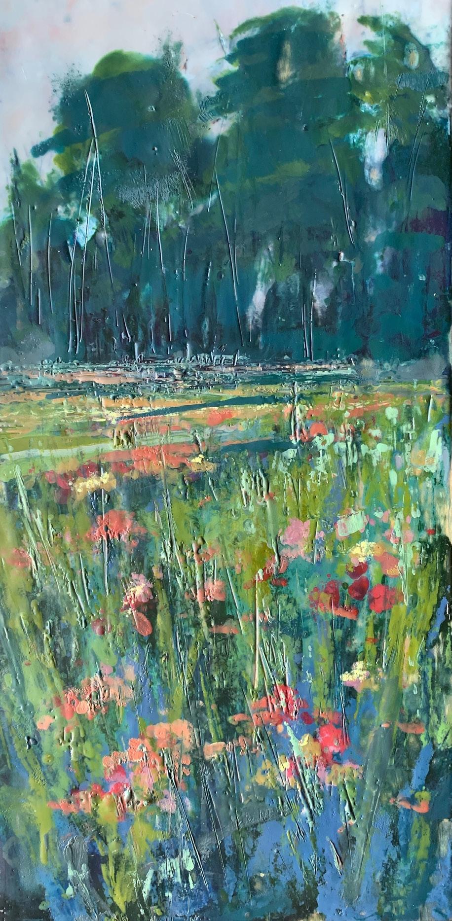 This encaustic mixed piece was begun with a sky created from water mixable oils. When I was ready for the flowers,I used a wax stylus. Creating texture in different colors captures sunlight and makes this piece glow.
