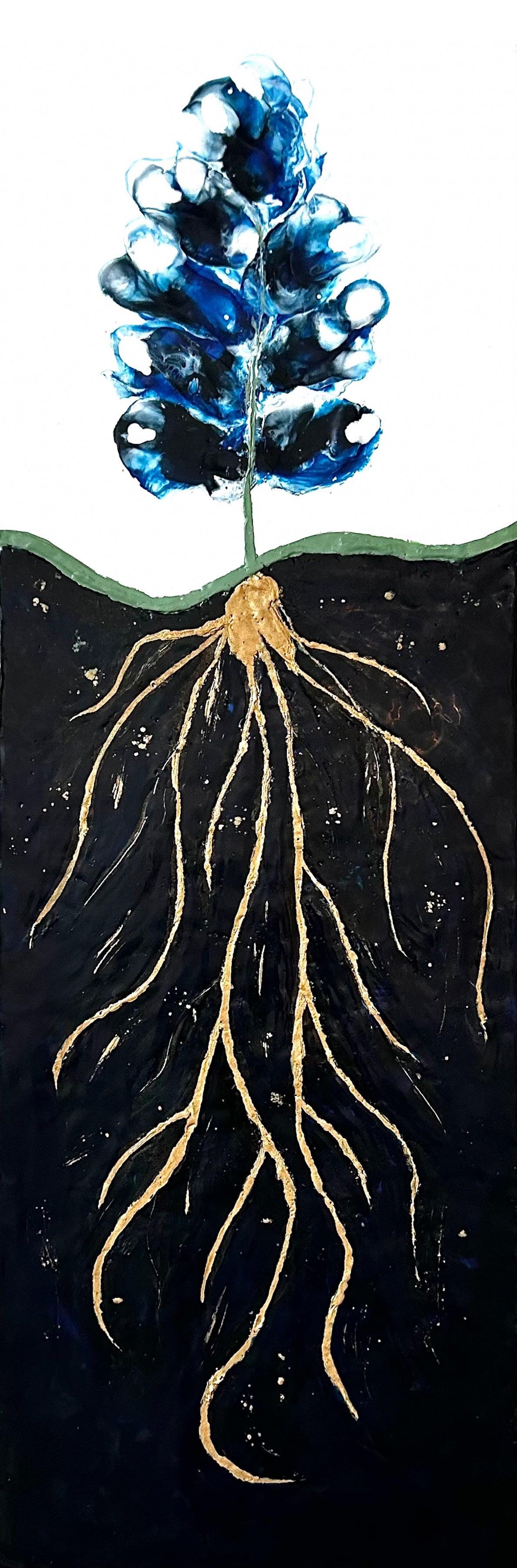 As I walk through the northern forest, I am awe-struck by the rich diversity of life on the forest floor beneath the leaf-litter. This painting, in encaustics, oils, and India inks, pays homage to the universe that unfolds as you look more and more closely at the world beneath your feet.
