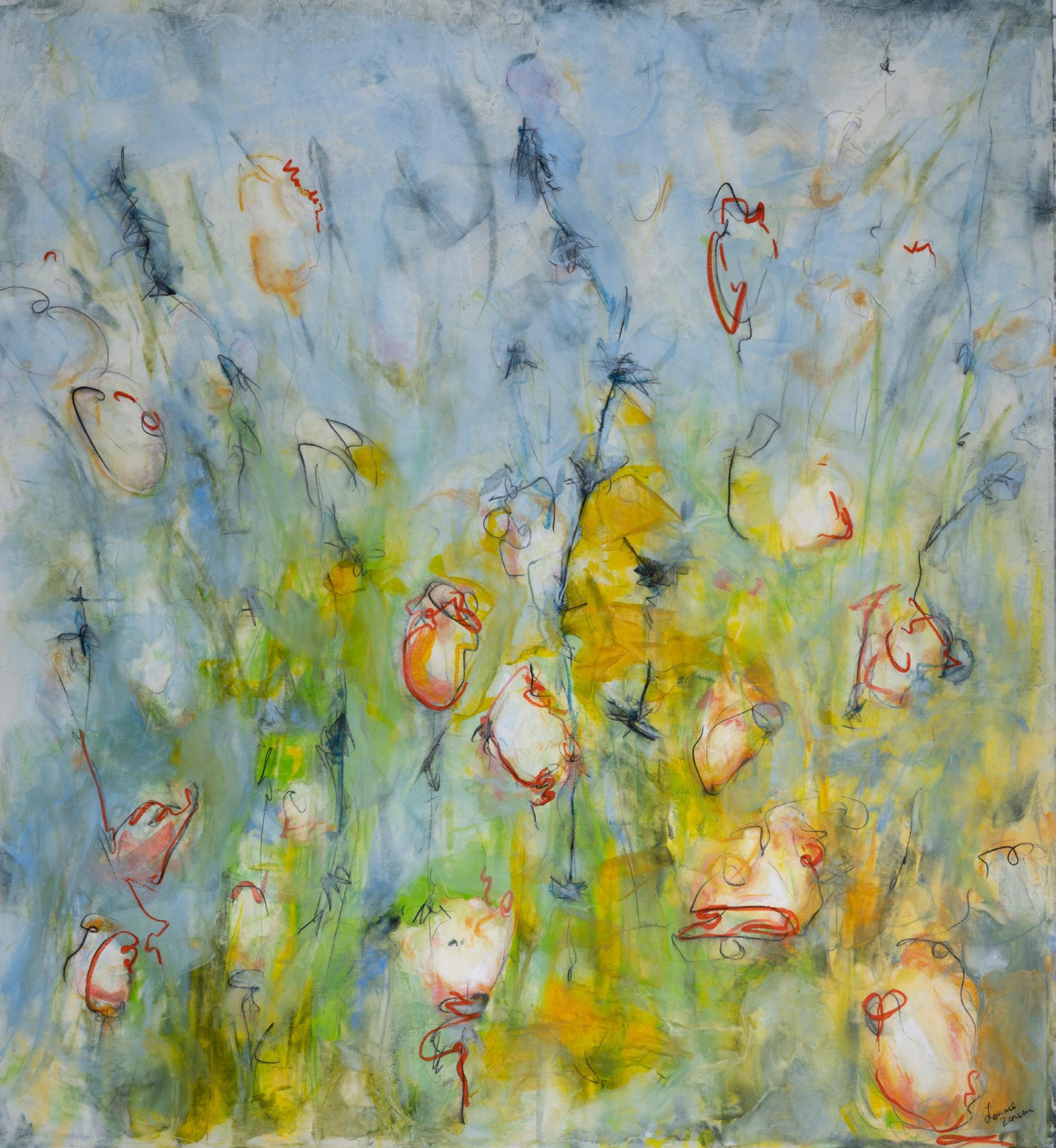 This is a large Encaustic Monotype. This was inspired by the absolute beauty that is present now, after the incredible California rains this year. The grasses, the flowers, the air, is so alive with color and movement that I can feel it flowing in me. In this piece I wanted to paint it as though I am in the field, surrounded by wildness, color, and flowers and then I can look on an on and only see more!