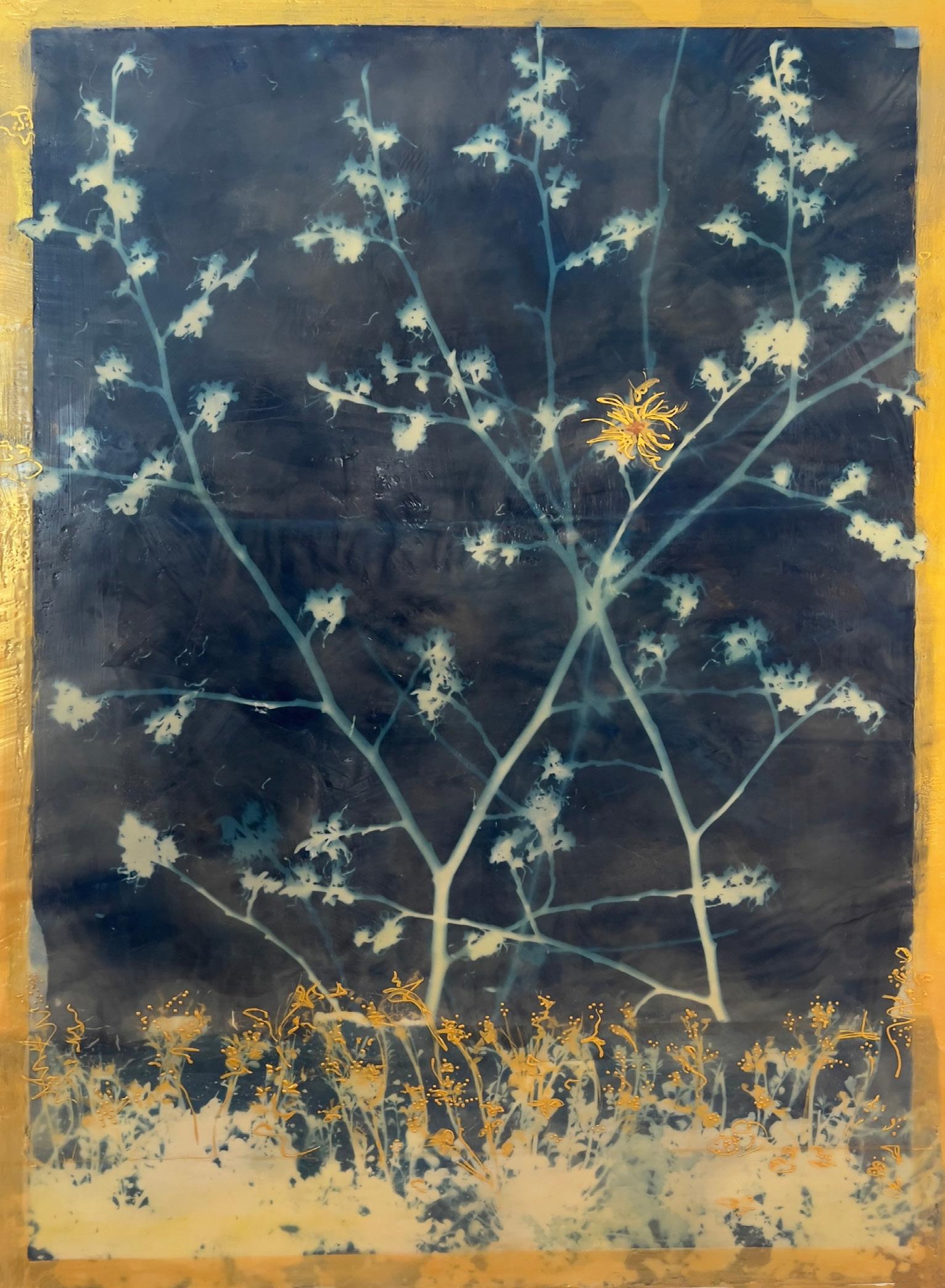 Encaustic and cyanotype painting. The cyanotype print features the Witch Hazel and Hairy Bittercress flowers. Both plants are native to my Pennsylvania home. The Witch Hazel flower appears in February, in the coldest part of our winter, giving a burst of color to an otherwise bland landscape. The Hairy Bittercress, typically considered a weed, arrives in March and April. Often, the two flowers coincide, bridging the end of winter with the begining of spring.