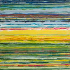 My abstract landscapes depict the horizontal aspects of a landscape that I see most strongly. Intentionally imperfect lines show earthy greens and browns, ethereal sky blues, sunny yellows, or the pink and orange tones of a remembered sunset.