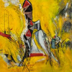 Pools of high color allude to passion, pictorial events and incidents that evoke a contemplative mood. The textures created with the encaustic medium, elements of collage, and oil give way to dragging brush strokes and scratchy details and visual drama.