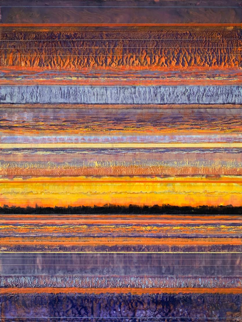 “Mesa” is a mixture of veneration and layers of encaustic wax, painted tissue paper, and pigment stick. The striated portraitlike collage fuses contrasting textured color with the wisdom of the New Mexico environment. Closely cropped and centered, my intension is to honor the memory of its presence so that future viewers can come to know it as if in person, outside the casita walls.
