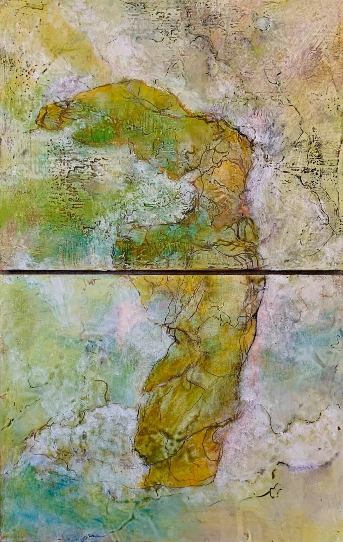 This diptych of abstract landscapes are meant to capture the a universal feeling of connectedness to nature. Each painting reflects the serene moments experienced while hiking through the lush trails of Vermont and Pennsylvania. With this painting I invite the viewer to immerse themselves in the tranquil beauty of the forest and consider the unity of the natural world.