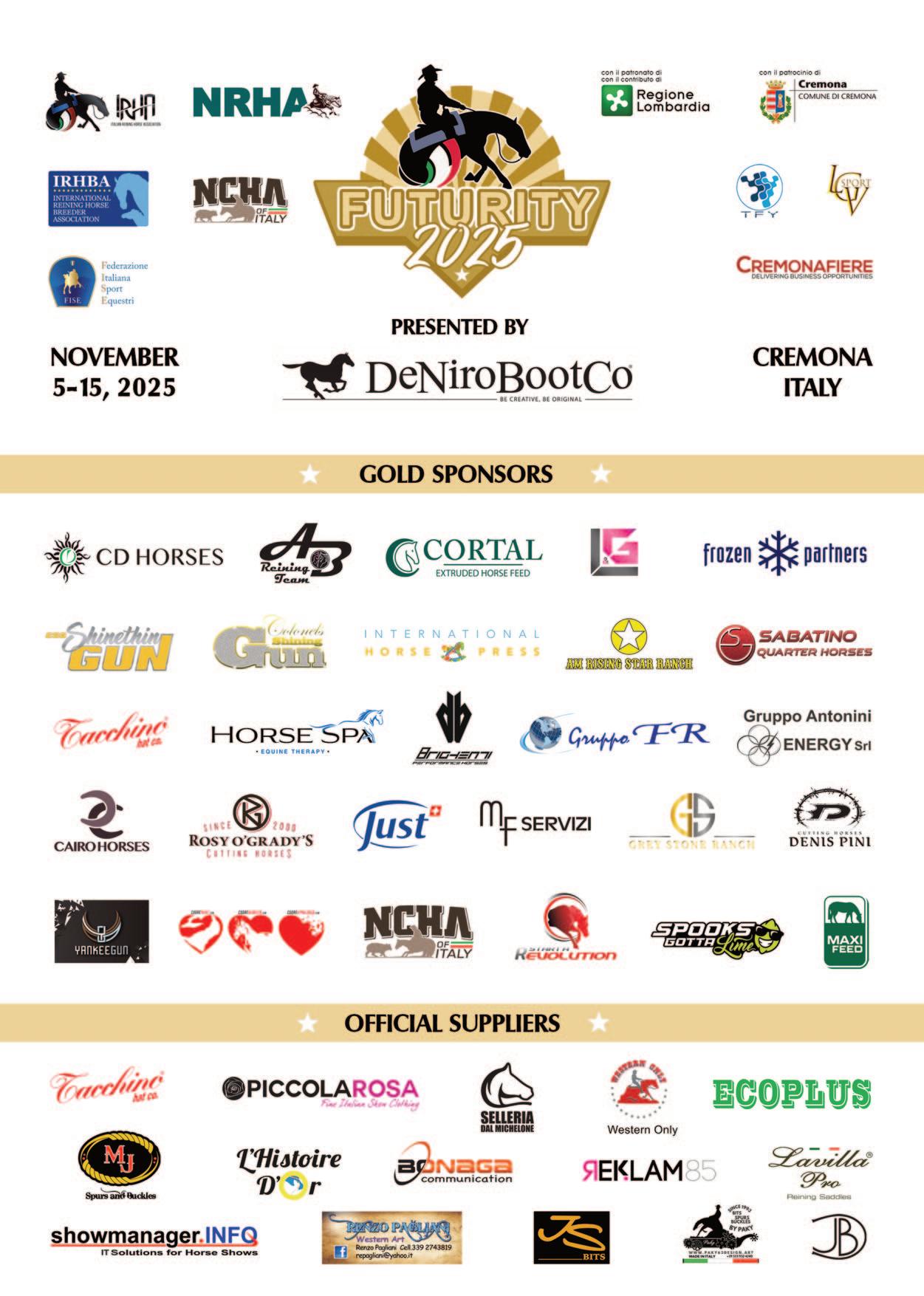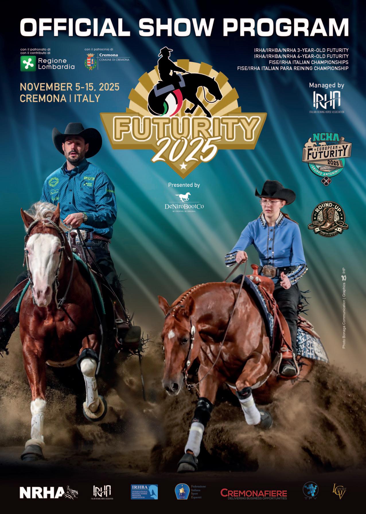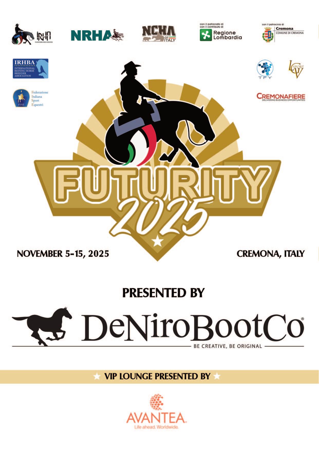 Welcome to the 41st edition of the $700,000-added Big Futurity! Once again, the event goes beyond competition, offering a spectacular experience thanks to upgraded staging and immersive entertainment. no a capo Participation continues to rise across the board: entries for the Futurity have reached all-time highs, and the number of exhibitors and sponsors has grown significantly - marking another year of doubledigit growth in 2025. As an internationally recognized equestrian event, the Futurity is proud to receive the continued support of Regione Lombardia, a key partner committed to promoting high-caliber trade fairs and world class sport.
