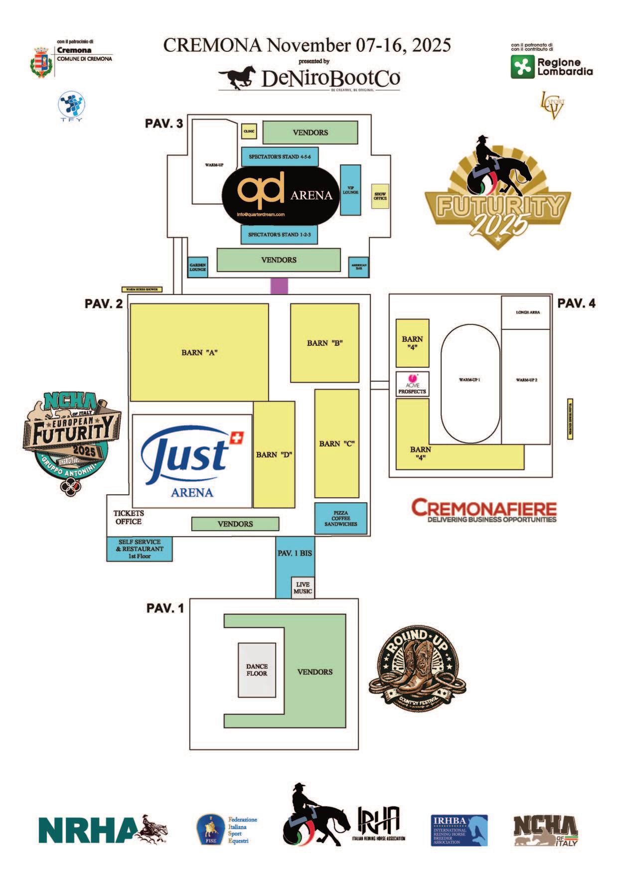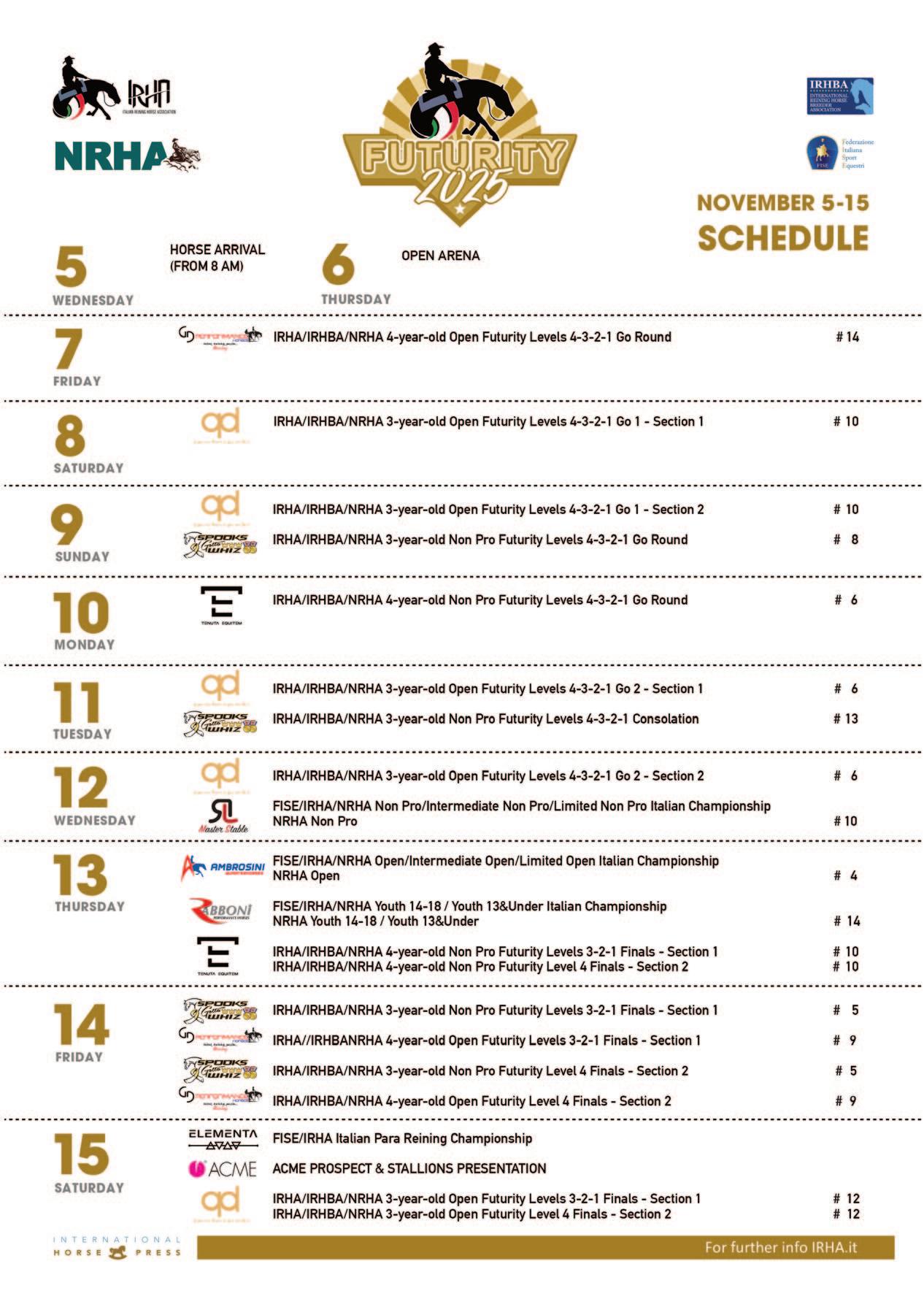 Oltre ai Futurity per cavalli di 3 e 4 anni e alle finali dei Campionati Assoluti della Federazione Italiana Sport Equestri (FISE), l’evento anche quest’anno includerà l’NCHA European Cutting Futurity (con un record assoluto di oltre 150 cavalli presenti) ed il rinnovato Roundup Country Festival con oltre 3.000 ballerini attesi.