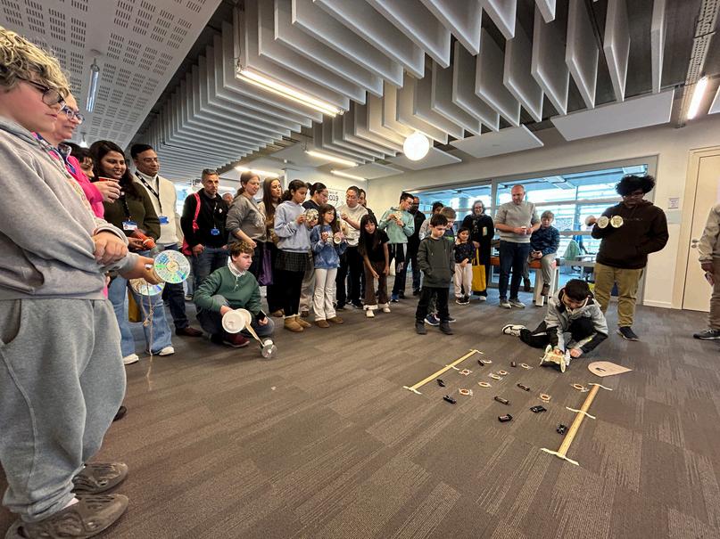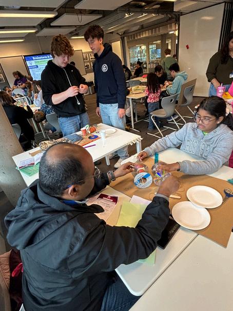Familiesparticipatedinthreemainactivities Thefirstwasthreeroundsoftrivia,wherefamilies testedtheirpidaygeneralknowledge,history,andpopculture Thesecondactivitywasamath chaseinwhichfamiliestraveledthrough12differentstationssolvingavarietyofmathematical problemsandpuzzles Eachcompletedchallengebroughtthemonestepclosertofinishingthe course ThethirdactivitywasaSTEMdesignchallengethatinvitedfamiliestodesignandbuild a “Pi Rover.” Using rubber bands as a source of stored potential energy, teams engineered smallvehiclesandtestedtheirdesignstoseehowwelltheyadheredtothedesignconstraints Families also enjoyed some Pi Day-themed refreshments, including pizza and apple pie, addingtothefestiveatmosphere.
