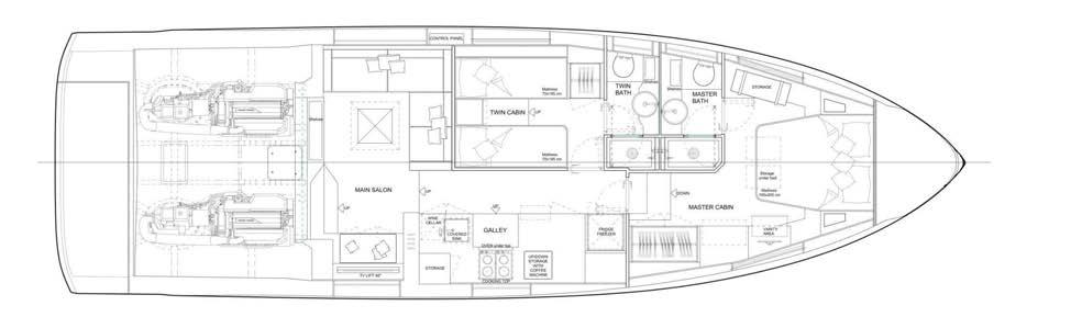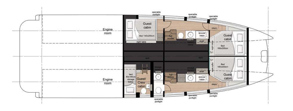 VIP, master and guest cabins in the bow. Crew cabin in the stern with a separate entrance. Price € 490.000.