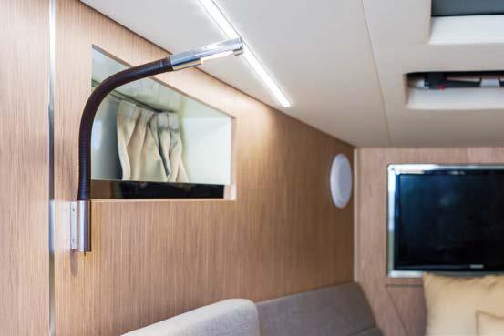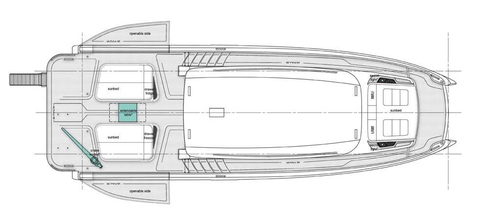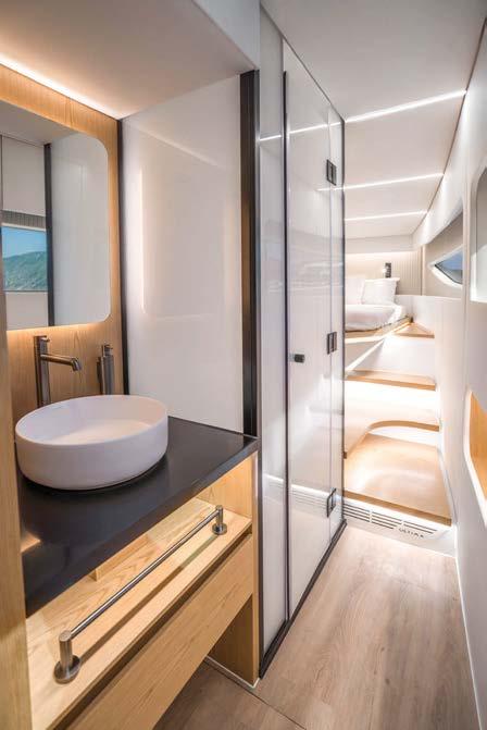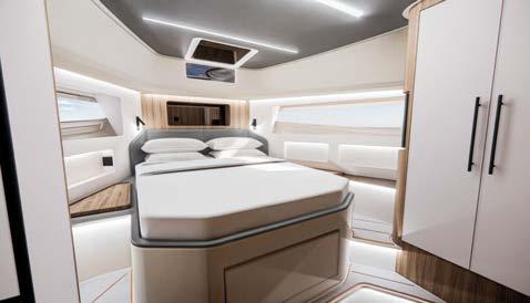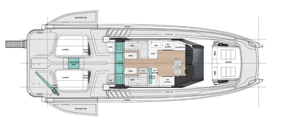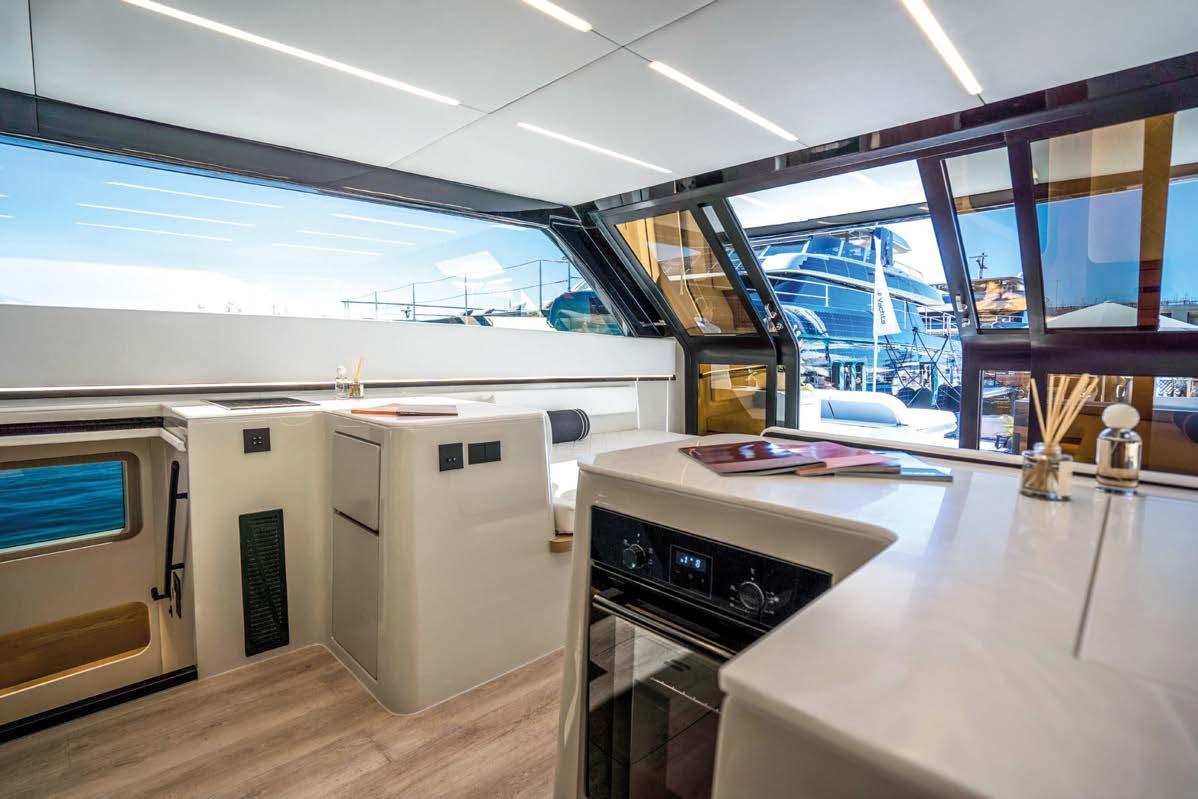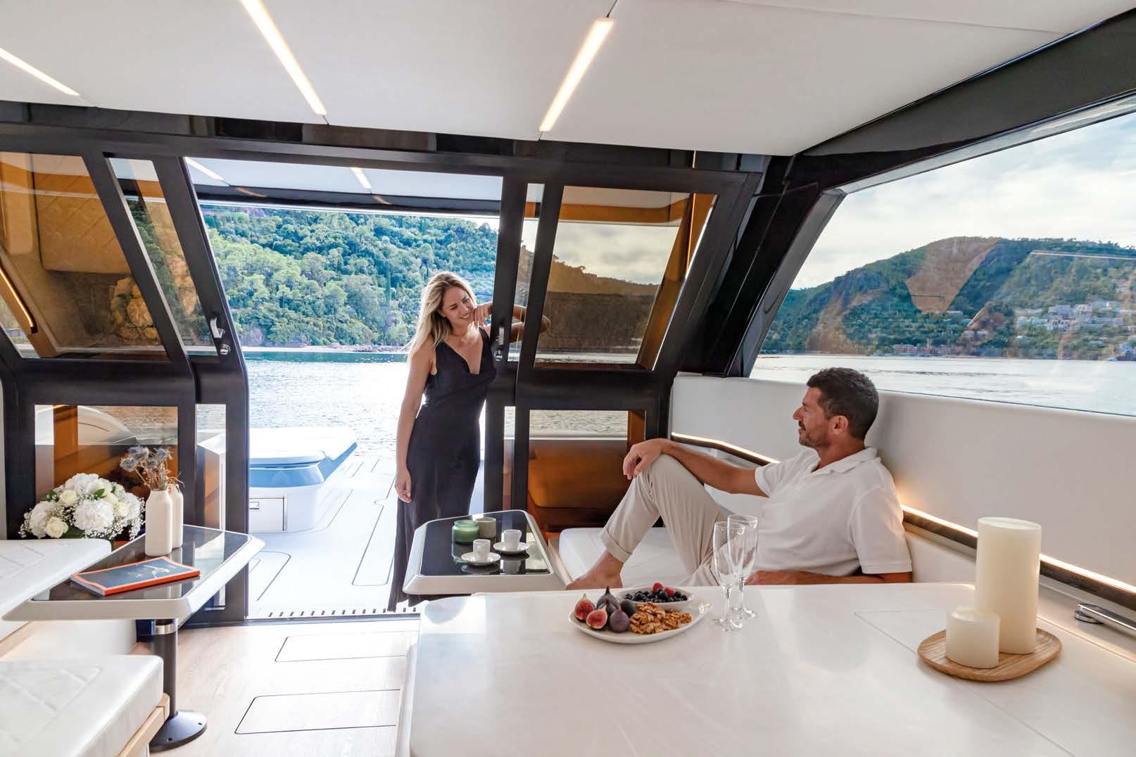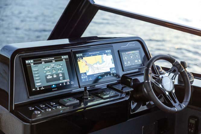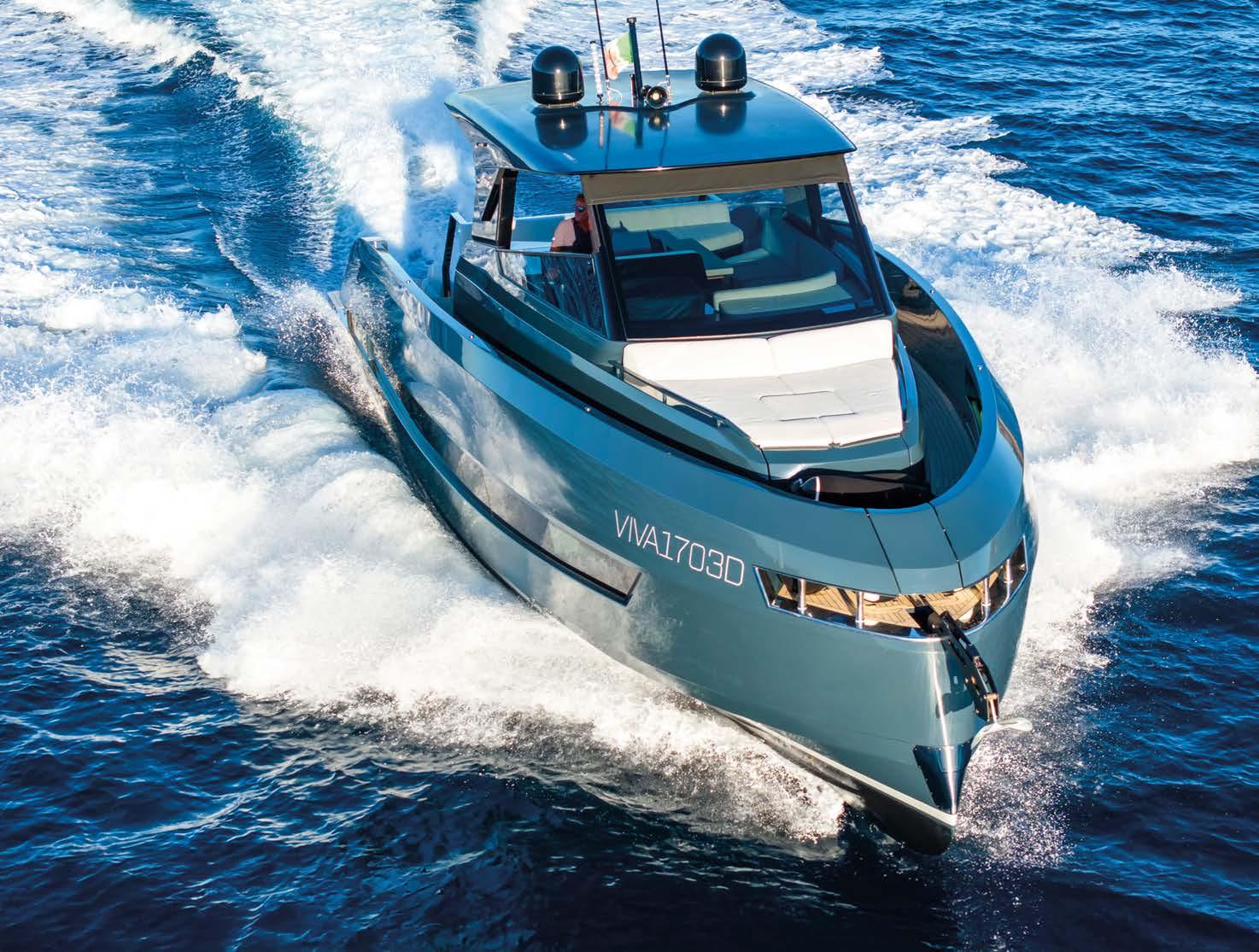 Greenline Yachts has unveiled a new 42-foot model. The hull reaches a top speed of 25 knots. It can be equipped with Greenline’s H-Drive 6G system for quiet electric manoeuvring and improved efficiency. Ten solar panels produce up to . kW to power all on-board systems and recharge the batteries more quickly.