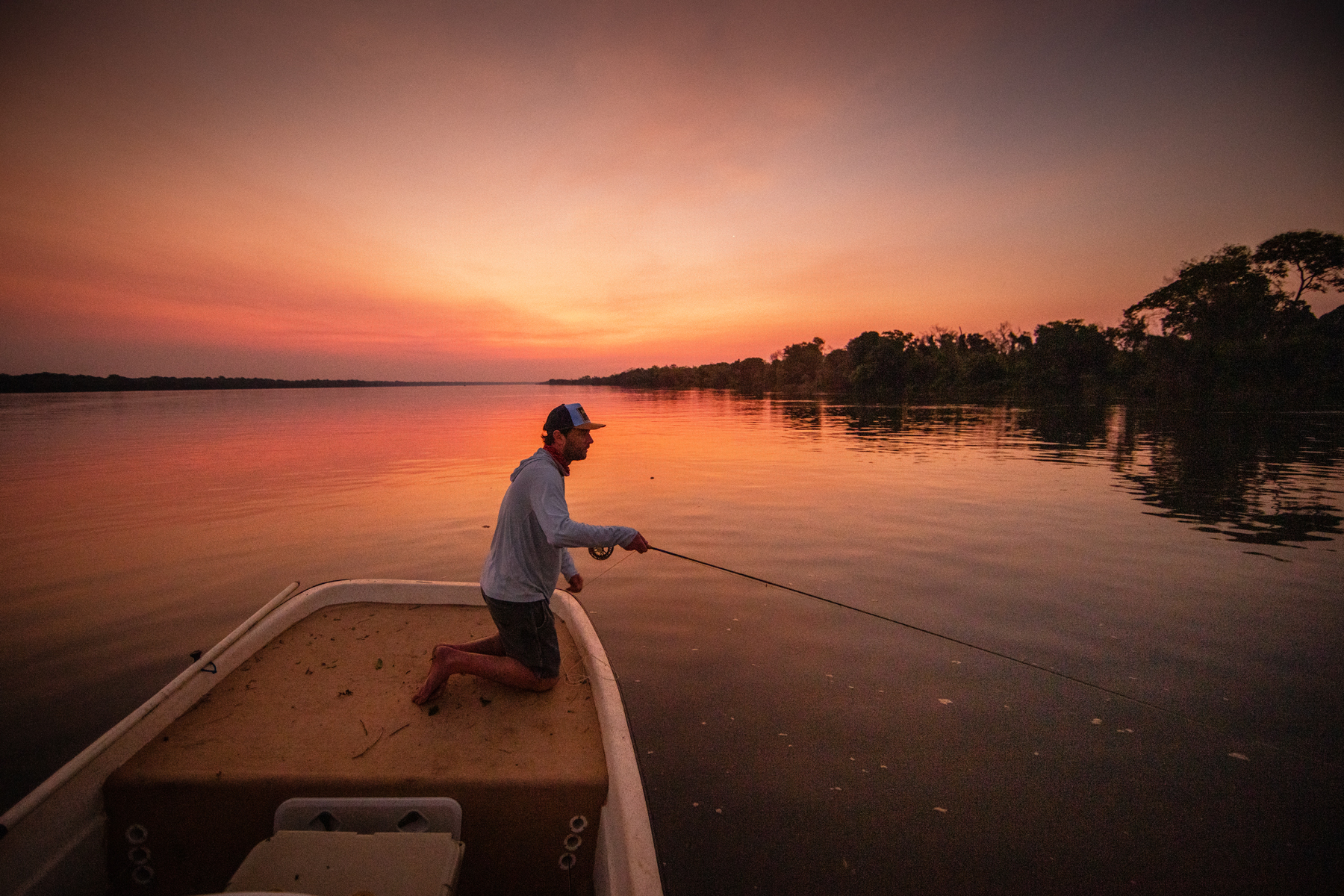 Once more, I take up station on the bow of the skiff and do as my excellent guide Pablo advises, pitching my fly towards the thickly wooded banks of the island. I draw the line tight and bring the big baitfish imitation flickering back over the sharply defined drop-off, the deeper, darker water still visible in the low evening light.