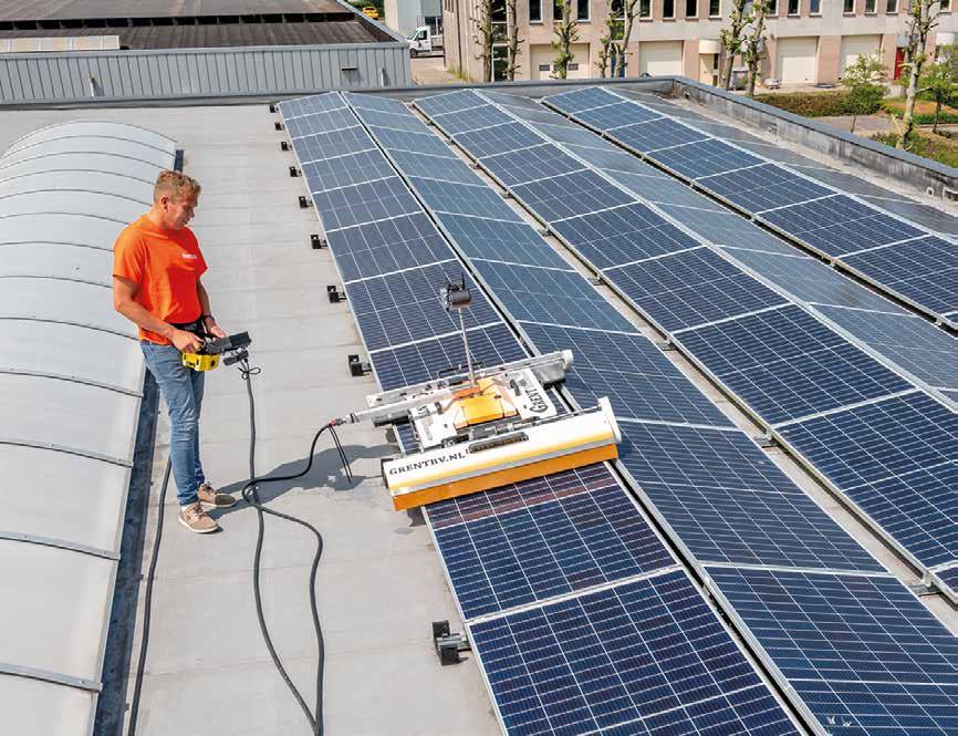 Naast mechanische oplossingen, is Barry ook geïnteresseerd in robotica. “We hebben een 1.20 meter brede robotreiniger, speciaal voor zonnepanelen. Die wordt radiografisch bediend en door de camera kun je precies zien wat je doet. Veel mensen weten niet dat zonnepanelen niet door de regen schoongespoeld worden, maar één à twee keer per jaar gereinigd moeten worden om het rendement te behouden. De robot doet dat met precies de juiste druk en met verwarmd osmosewater. De volgende ontwikkeling waar ik nu naar uitkijk is het reinigen met behulp van drones.”