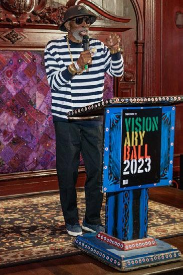 Clockwise from upper left: artist Tarik Echols visits the Tarik Echols: Open exhibition; Intuit Teacher Fellows enjoy the opening of the 2023 Student Exhibition; supporters and board members take a hard hat tour of the building renovation; Guest Service Associate Joshua Willis welcomes guests to the Ted Degener: At Home with Artists exhibition; YoPro President Shawn Grenald donates to Intuit while Board Chair Tracy Holmes looks on at the 2023 Visionary Ball; Teacher Fellows answer questions at the 2023 Student Exhibition; artist Dr. Charles Smith (center) receives the Visionary Award from board member Cleo Wilson, including a portrait by artist David Lee Csicsko (left), with 2023 Visionary Ball chair Lionel Rabb and Vivian Society member Lisa Stone (at right); and Deb chats with Cheryl Mashack, great-grandniece of artist Nellie Mae Rowe, following the screening of the film This World is Not My Own about Rowe’s “discovery” by Judith Alexander.