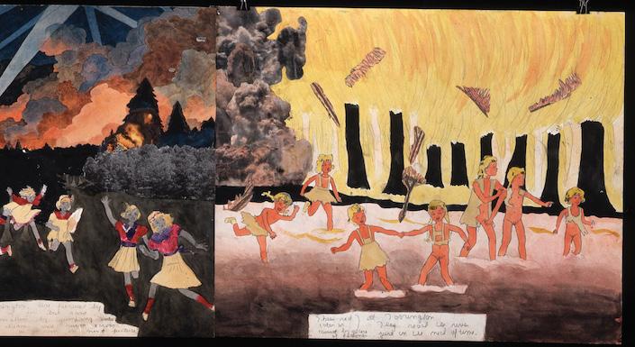 Henry Darger (American, 1892-1973). At Sunbeam Creek, are with little girl refugees again in peril from forest fires. but escape this also, but half naked and in burned rags. / At Torrington. Are persued by a storm of fire but have them lives by jumping into a stream and running across as seen in next picture / At Torrington. They reach the river just in the nick of time. Their red color is caused by glare of flames... (double-sided), mid-20th c. Watercolor, pencil, carbon tracing and collage on pieced paper. 19 x 70 1/2 in. Collection of American Folk Art Museum, New York. Anonymous gift in recognition of Sam Farber © Kiyoko Lerner. 2004.1.2A.